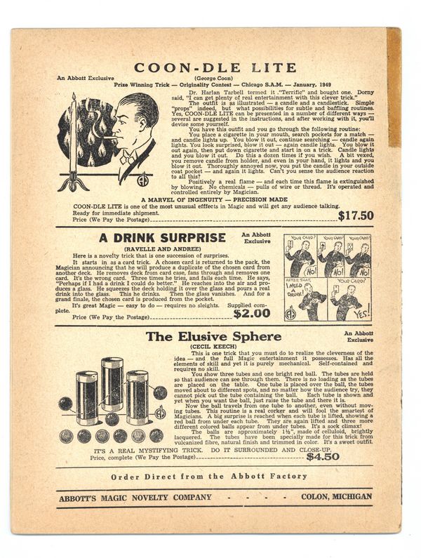 Published 1949 (est.) by Abbott Magic & Novelty Co..$16.00- Spine split 30%.