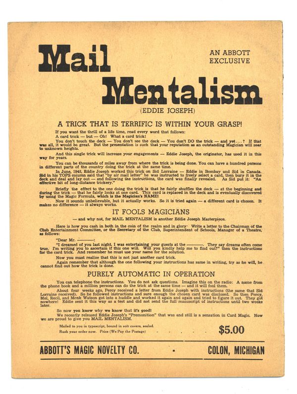 Published 1949 (est.) by Abbott Magic & Novelty Co..$34.00If you add this item to your want list, we will email you when it becomes available.
