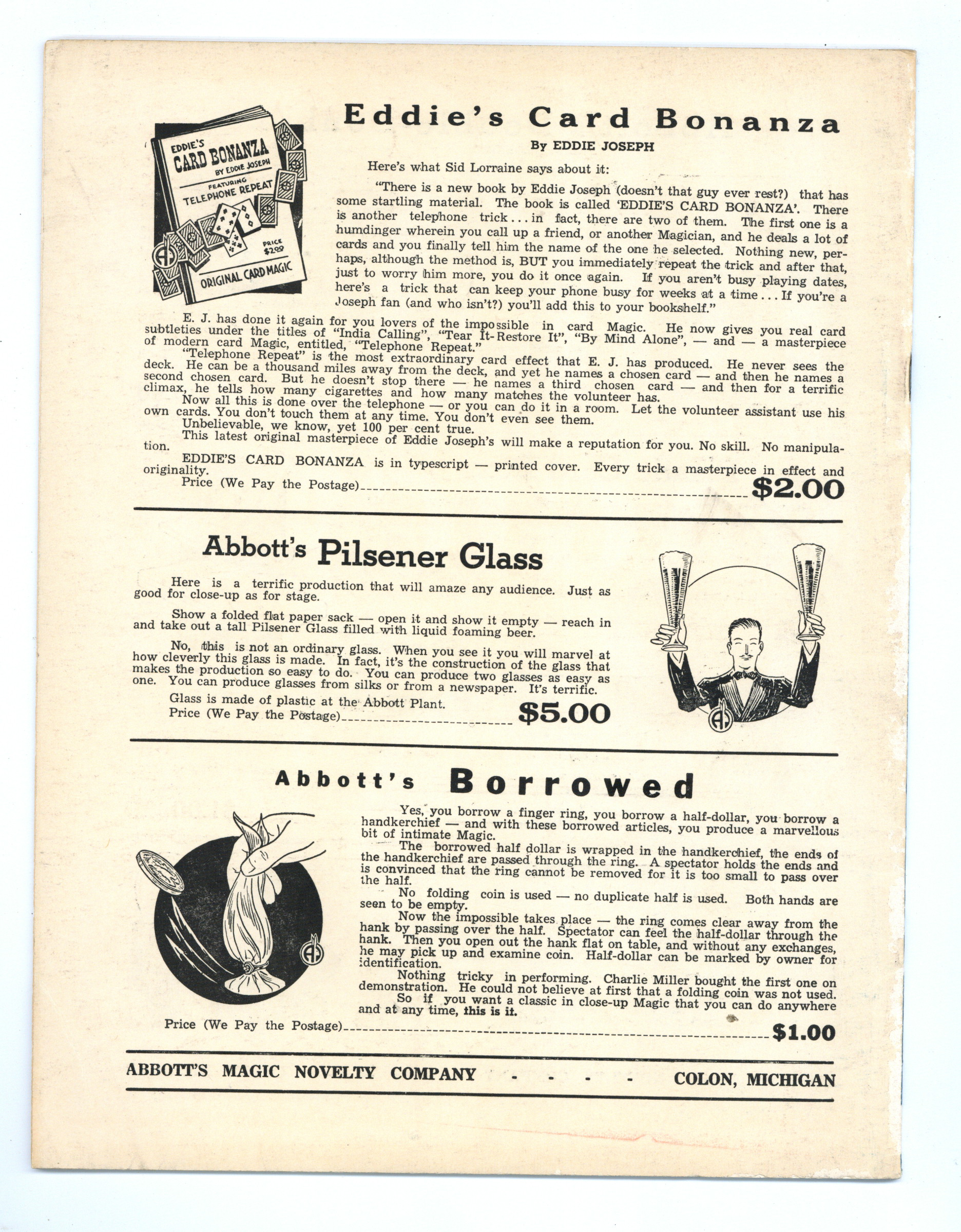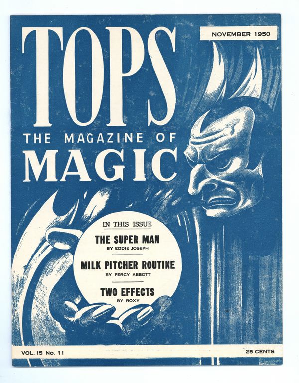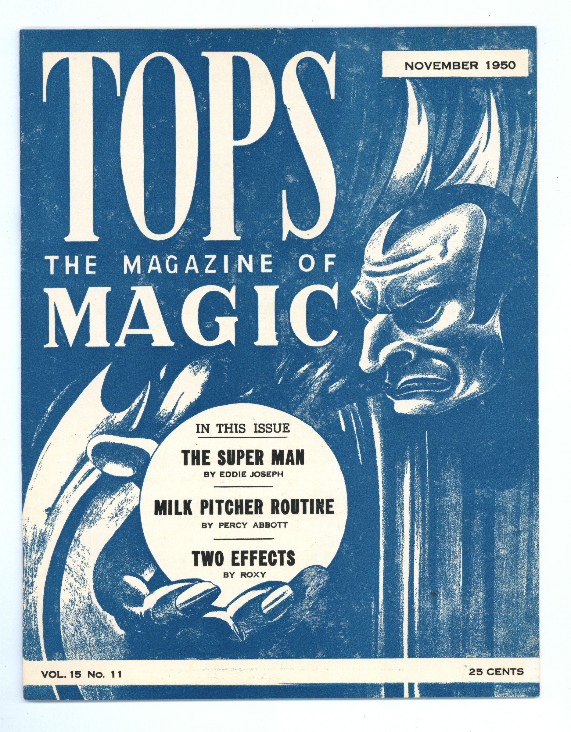 Published Nov 1950 by Abbott Magic & Novelty Co..$22.00Vol. 15, No. 11 - November , 1950. Independent magazine in which those interested in Magic may express their thoughts, ideas, and criticisms. 8.5" x 11", 28 pages, B&W. Cover price $0.25.