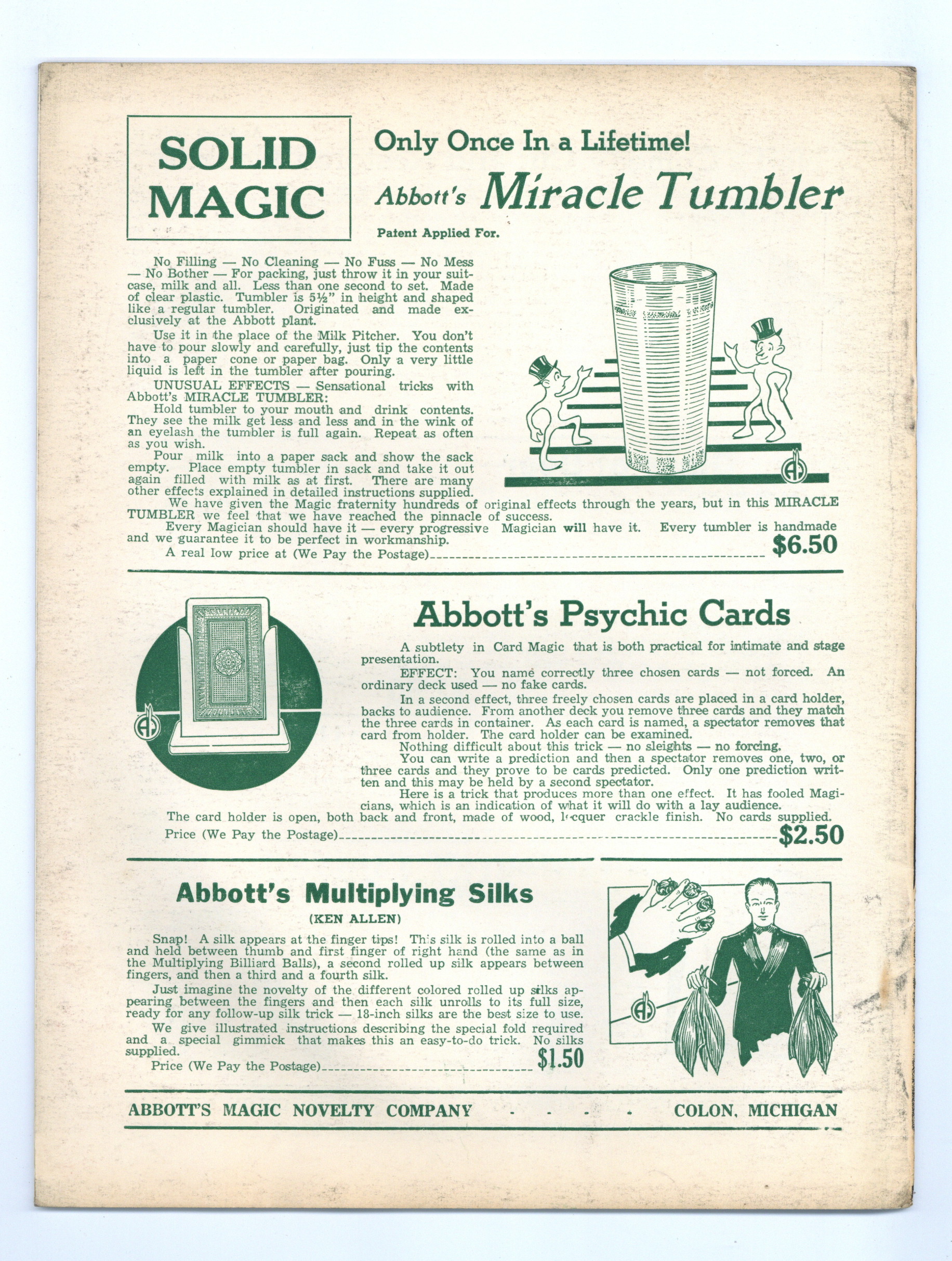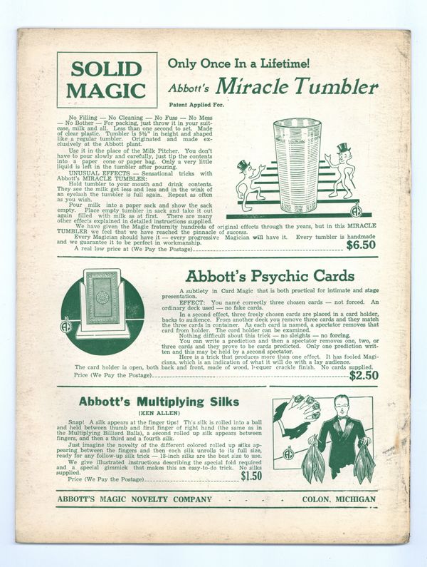 Published 1951 (est.) by Abbott Magic & Novelty Co..$16.00- Staple rust: Slight.