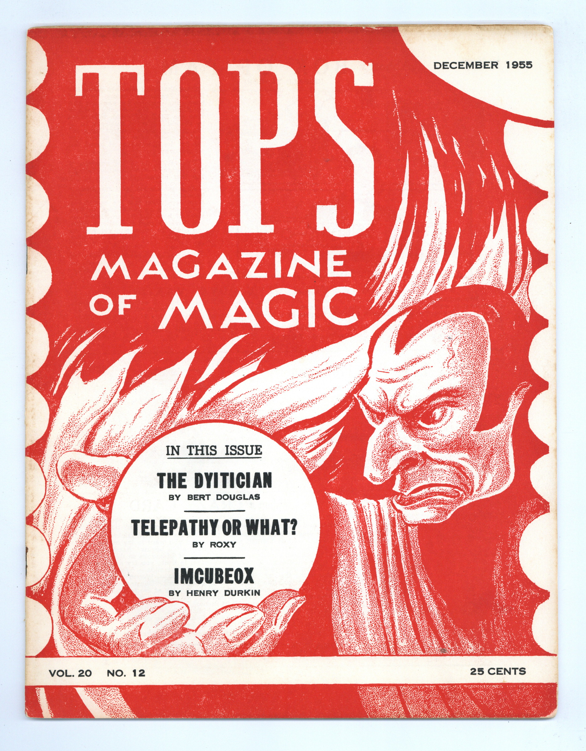 Vol. 20, No. 12 - December , 1955. Independent magazine in which those interested in Magic may express their thoughts, ideas, and criticisms. 8.5" x 11", 28 pages, B&W. Cover price $0.25.