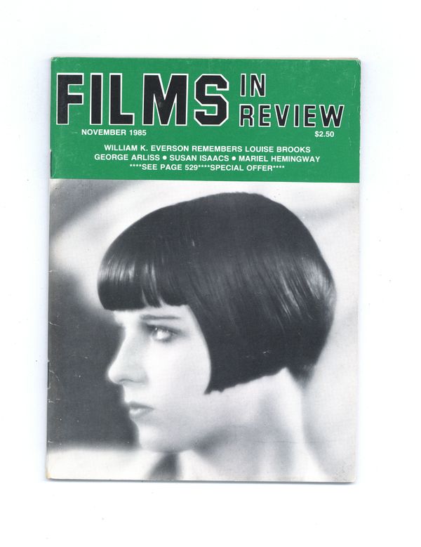 Published Nov 1985 by National Board of Review of Motion Pictures Inc..$35.00Film in Review is a publication of the National Board of Review of Motion Pictures, Inc, an independent, non-profit organization of public citizens founded in 1909 to represent the interests of the motion picture public. This National Board further assists the development of the motion picture as a source of entertainment, as education, and as art, by providing media for the expression of the public's opinion about films and their cultural and social effects. This issue features a Louise Brooks cover. 5 1/2-in. x 7 1/2-in., 64 pages, B&W. Cover price $2.50.