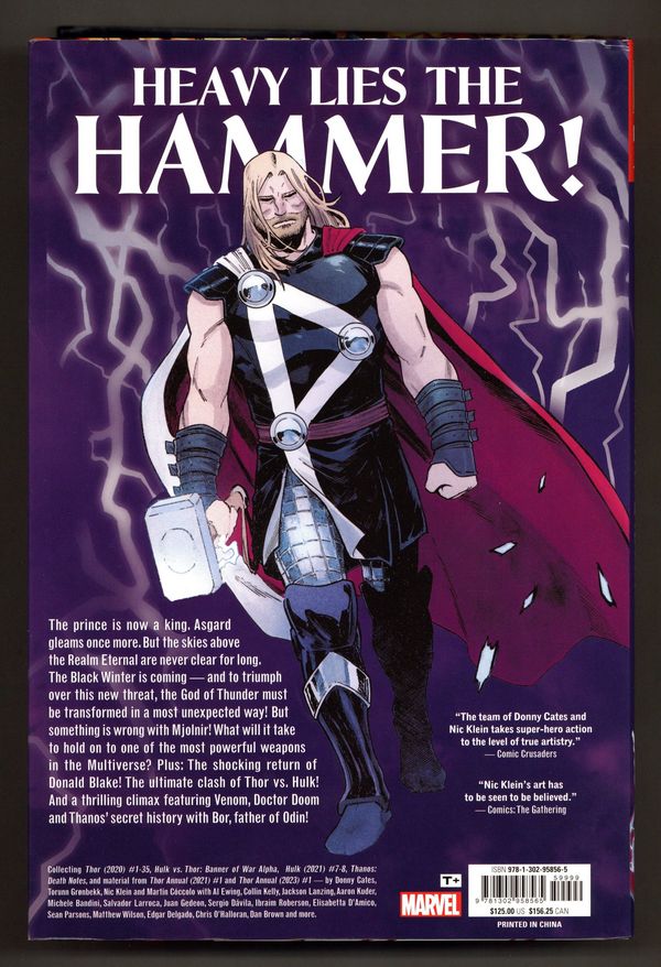 1st printing. Collects Thor (2020-2023) #1-35, Hulk vs. Thor: Banner of War Alpha (2022 Marvel), Hulk (2022 Marvel) #7-8, Thanos: Death Notes (2022 Marvel), and material from Thor (2020 Marvel 6th Series) Annual #1 and 2023. Written by Donny Cates, Walt Simonson, Tom DeFalco, Ron Frenz, Dan Jurgens, J. Michael Stracynski, Al Ewing, Jason Aaron, Daniel Warren Johnson, Torunn Gronbekk, Christopher Cantwell, Kyle Starks, Aaron Kuder, Collin Kelly, Jackson Lanzing, Cheryl Lynn Eaton, and Nadia Shammas. Art by Nic Klein, Aaron Kuder, Michelle Bandini, Elisabetta, Pasqual Ferry, Bob Quinn, Walt Simonson, Ron Frenz, Brett Breeding, Dan Jurgens, Klaus Janson, Olivier Coipel, Lee Garbett, Das Pastoras, Martin Coccolo, Salvador Larroca, Andrea Di Vito, Travel Foreman, Geoff Shaw, Ron Lim, Juan Gedeon, Sergio Dávila, Sean Parsons, Cam Smith, Ibram Roberson, ChrisCross, and Simone D'Armini. Cover by Nic Klein. Back Cover by Michelle Bandini. Introduction by Donny Cates. The prince is now a king. The realms are at peace. All of Asgard lies before Thor, God of Thunder - but the skies above the Realm Eternal are never clear for long. The Black Winter is coming - and to triumph over this new threat, Thor must be transformed in a most unexpected way! But something is wrong with Mjolnir! What will it take to hold on to one of the most powerful weapons in the Multiverse? Plus: Thor revisits his old mortal persona, but he isn't ready for the terrifying Donald Blake that awaits! Odin makes a surprising return! Thor battles Marvel heavyweights Venom, the Hulk and Doctor Doom! And what secret history does Thanos have with Bor, father of Odin? Hardcover, 8 1/2-in. x 11-in., 1,048 pages, full color. Rated T+ Cover price $125.00.