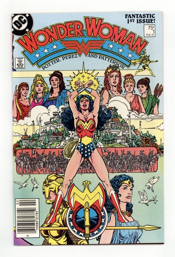 Starts Jan 19 Newsstand Edition. In this post-Crisis on Infinite Earths re-imagining of the Wonder Woman mythos, Diana is born of clay, growing on Paradise Island to become the champion of the Amazons. "The Princess and The Power!" Part 1 of 6, continued next issue. Script by Greg Potter, co-plot and pencils by George Perez, inks by Bruce Patterson. Perez inks first 2 pages and the final page. Wrap-around cover. No ads. Perez cover. 36 pgs. Cover price $0.75.
