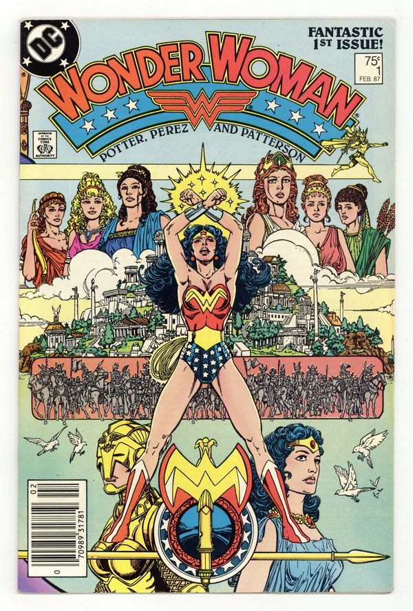 Tags: Wonder Woman$20.00Newsstand Edition. In this post-Crisis on Infinite Earths re-imagining of the Wonder Woman mythos, Diana is born of clay, growing on Paradise Island to become the champion of the Amazons. "The Princess and The Power!" Part 1 of 6, continued next issue. Script by Greg Potter, co-plot and pencils by George Perez, inks by Bruce Patterson. Perez inks first 2 pages and the final page. Wrap-around cover. No ads. Perez cover. 36 pgs. Cover price $0.75.