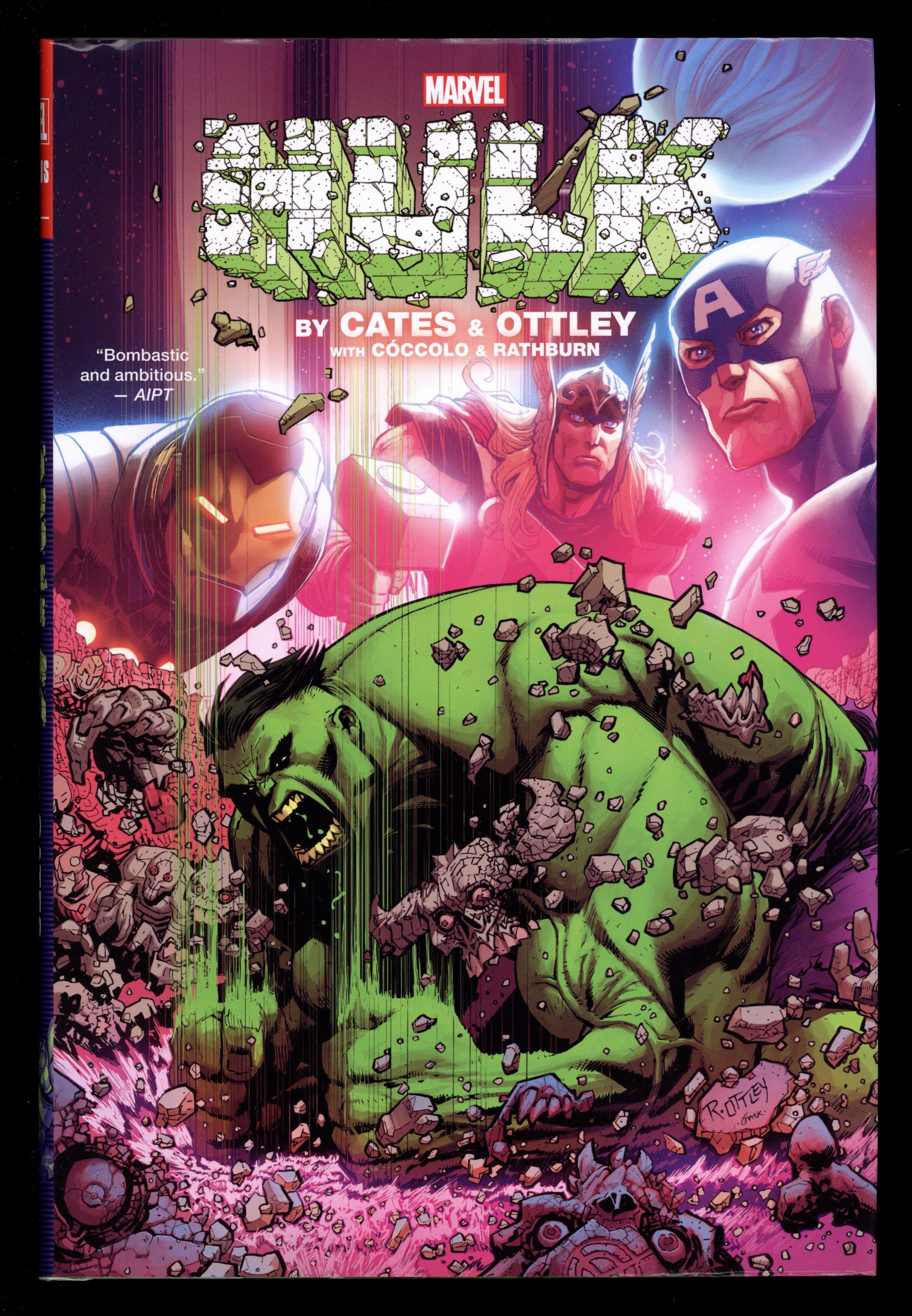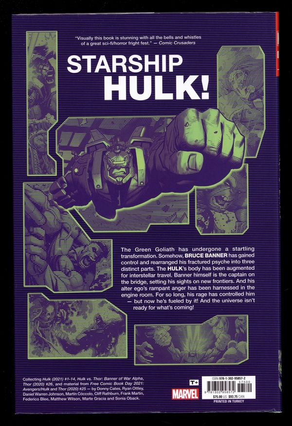 1st printing. Collects Hulk (2022 Marvel) #1-14, Hulk vs. Thor: Banner of War Alpha (2022 Marvel), Thor (2020-2023 Marvel 6th Series) #26, and material from Avengers/Hulk (2021 Marvel) FCBD and Thor (2020-2023 Marvel 6th Series) #25. Written by Donny Cates, Daniel Warren Johnson, and Ryan Ottley. Art Ryan Ottley, Cliff Rathburn, and Martin Coccolo. Cover by Ryan Ottley. Bruce Banner thinks he finally has total control of his emerald alter ego - but unexpected variables can arise at any time, and there are some things even his brilliant mind cannot imagine. As Bruce hurtles deep into outer space on a dangerous quest, he's about to find out that the Hulk isn't alone! When mysterious circumstances bring him into conflict with Thor, can a more-powerful-than-ever God of Thunder triumph against a Bruce Banner who can now control his rage? And will Iron Man regret coming between these two titans? Then, as Banner's space odyssey continues, an entire planet of Hulk-like creatures may offer the paradise he's been looking for - or a new nightmare waiting to unfold! Get ready to meet Titan, the Hulk's Hulk! Hardcover, 8 1/2-in. x 11-in., 424 pages, full color. Rated T+ Cover price $75.00.
