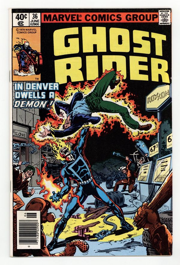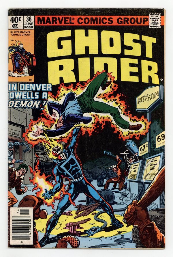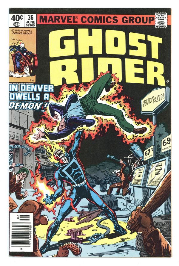 Newsstand Edition. First 40c cover-priced issue - "A Demon in Denver!" Story by Michael Fleisher. Art by Don Perlin. Cover by Bob Budianski and Bob Wiacek. Johnny Blaze learns that some days it's just not easy being the Ghost Rider. Spider-Man stars in Hostess ad " Hotshot on the Block!" Cover price $0.40.