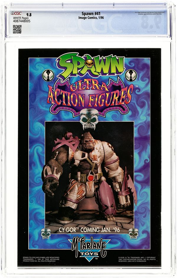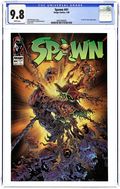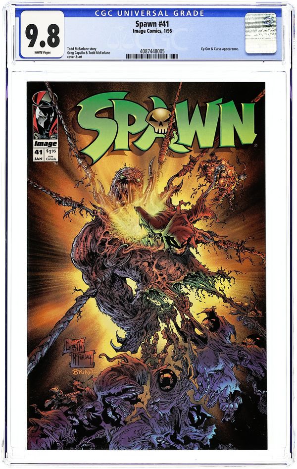 Direct Edition. Written by Todd McFarlane. Art and cover by Greg Capullo and Todd McFarlane. "Fugitives: Part 2 of 2!" Curse continues his sadistic torture of Spawn. With the physical part complete, he begins to mentally dissect Spawn, searching for the knowledge that will enable him to overpower the master of all evil. Spawns uniform eventually wins the fight to come to life, and reassembles. As Spawn is engulfed by its force, the maniacal Curse lunges for a switch, self-destructing the castle and everything in it. Elsewhere, Cy-Gor continues his journey towards New York City for an as yet undetermined reason. 32 pages, FC. NOTE: This issue is dedicated to Michael Golden. Cover price $1.95.