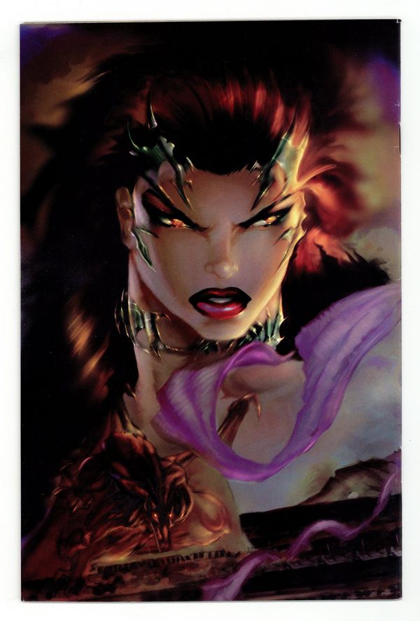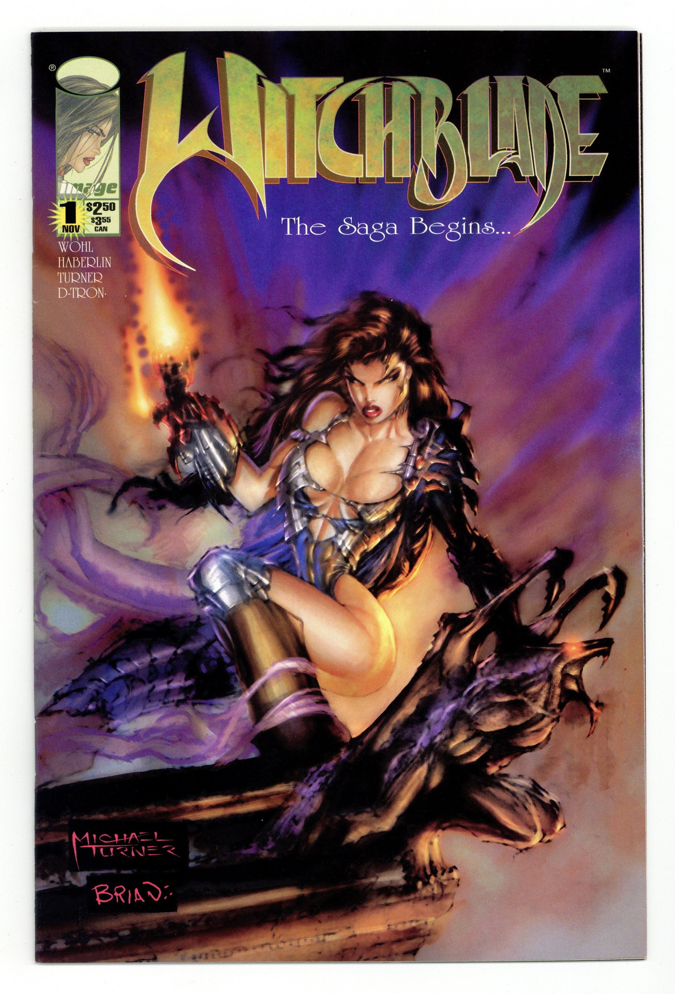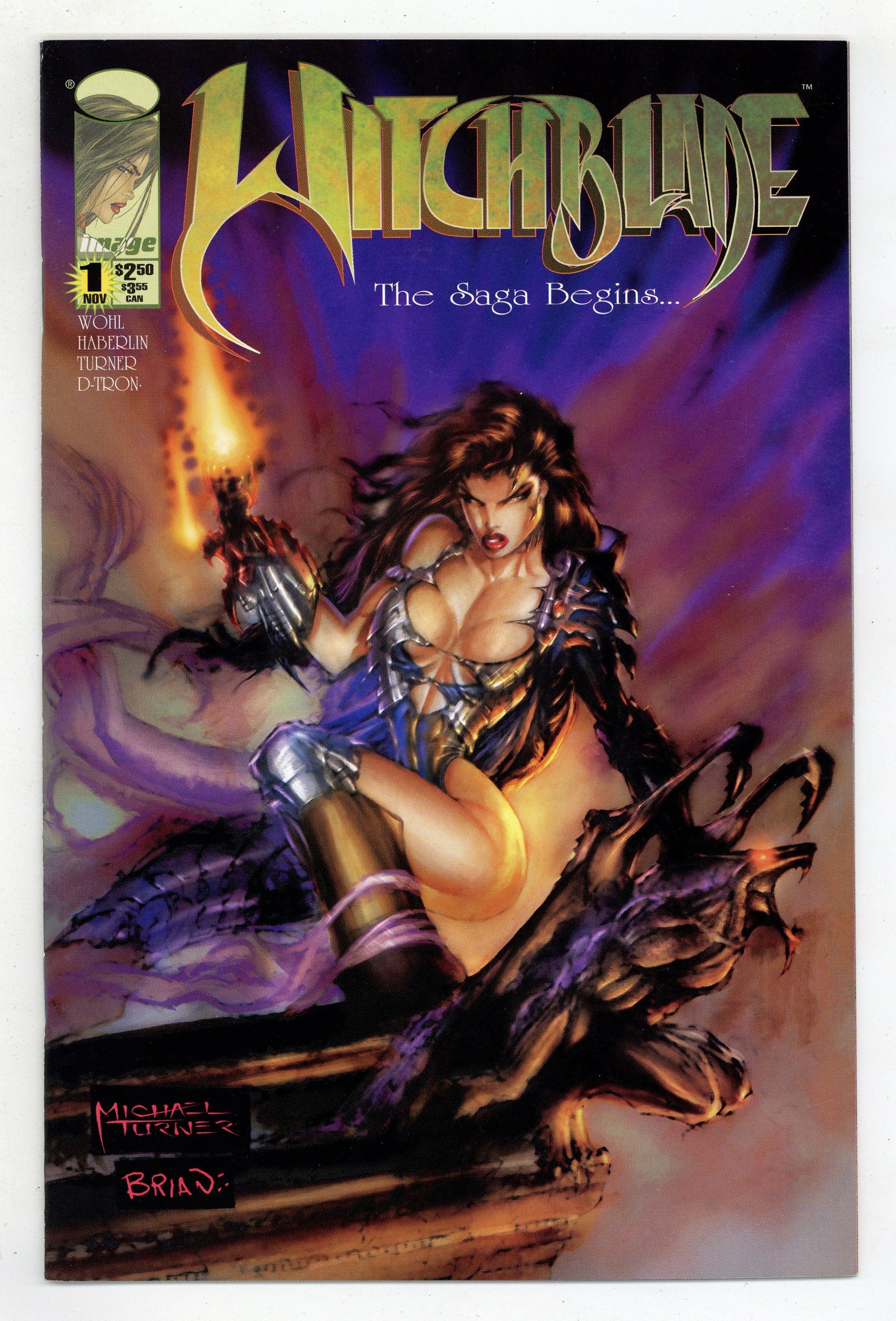 Wraparound cover art by Michael Turner. Untitled Witchblade story, script by David Wohl, Brian Haberlin (co-plot), and Michael Turner (co-plot), pencils by Michael Turner, inks by D-Tron. Police officer Sara Pezzini dresses to kill and engages in an unauthorized sting of a group of local drug dealers; she is chewed out by her boss for her antics and because she endangered her partner, Michael Yee, who was already undercover on the operation. During the interrogation of drug informant Drexler, Sara and Michael learn about something big going down at the old Rialto theatre on that very night, but on their way to the Rialto, Sara and Michael are called to a crime scene where the victim has literally been cooked from the inside out. Superstar businessman Kenneth Irons and his deadly bodyguard, Nottingham, begin their tournament by offering paying attendees a chance to try on a mystic gauntlet called the Witchblade. Sara has snuck in solo and watches in horror as mob boss, Cugliani, sticks his hand into the Witchblade and has it burned off; Irons' men catch Michael lurking about outside and prepare to execute him. 36 pgs. $2.50. Cover price $2.50.