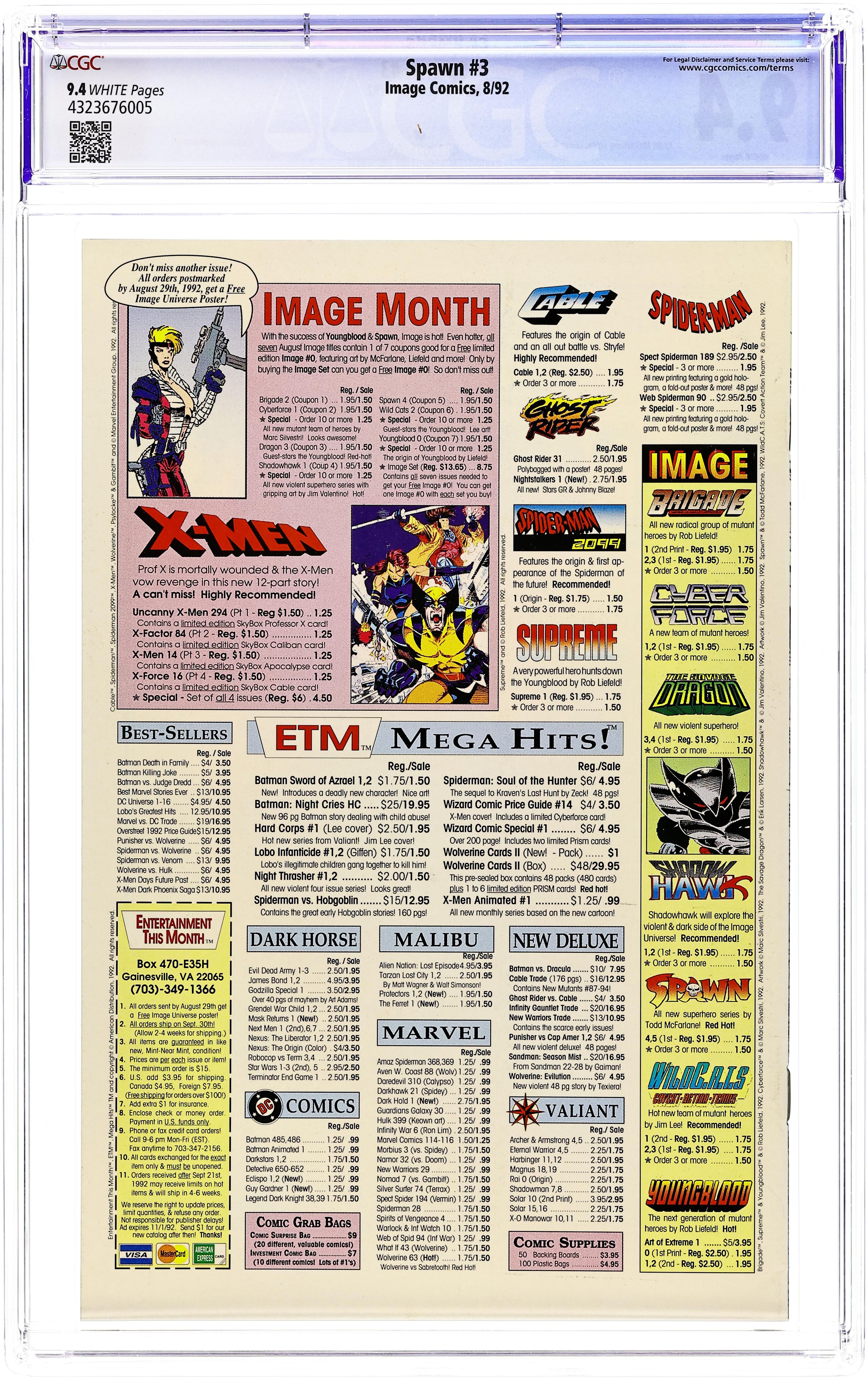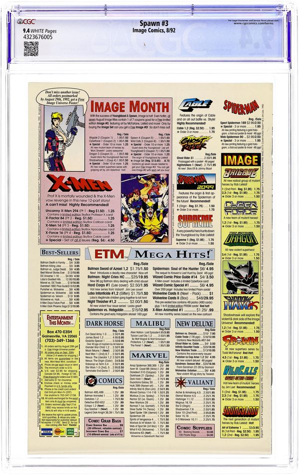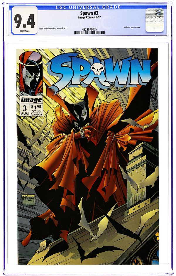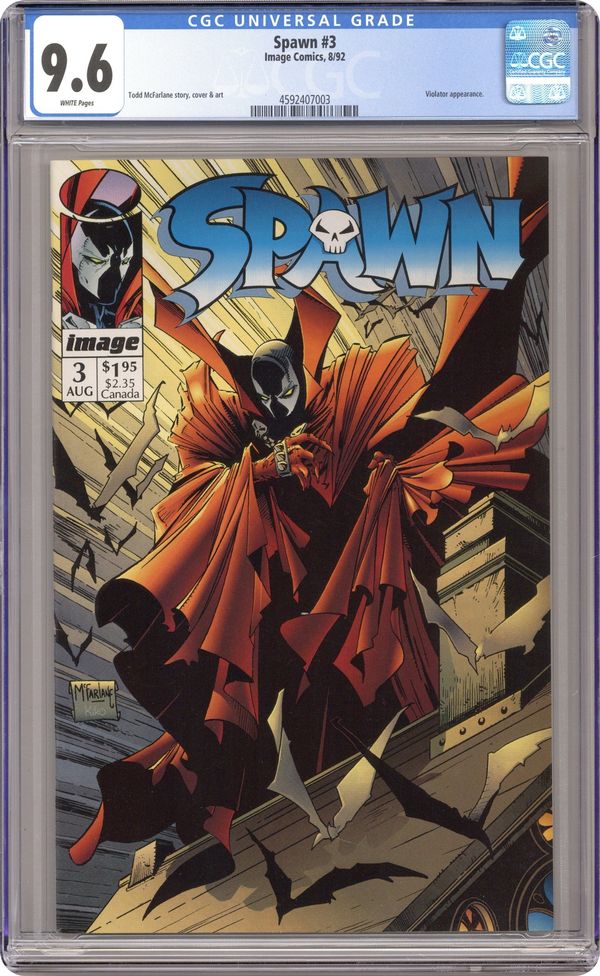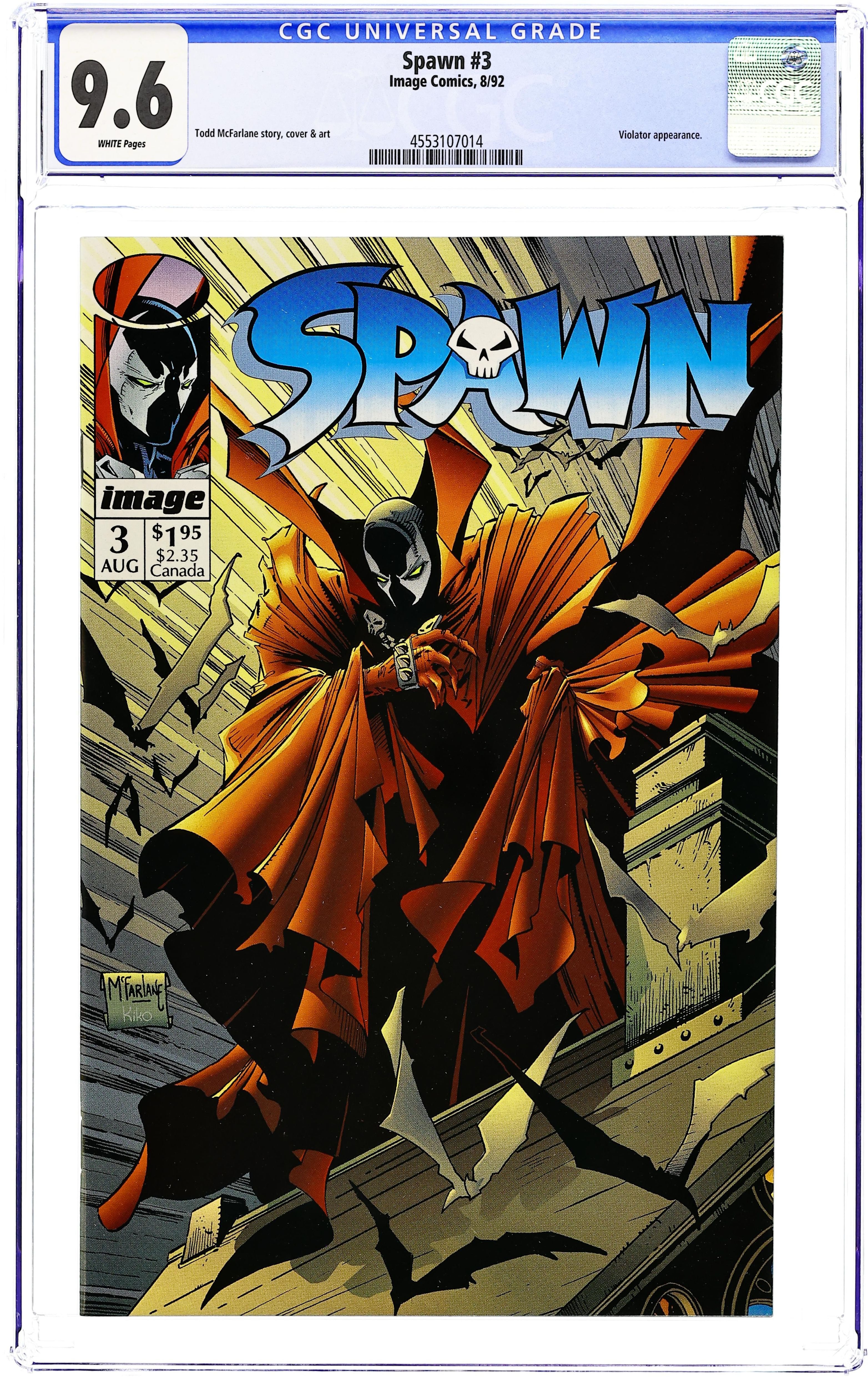 Direct Edition (has no bar code on cover) - "Questions!" Part 3 of 4. Created, story, and art by Todd McFarlane. Spawn finally confronts his wife, five years after his death. Plus, can this newly born Spawn survive a battle with a true denizen from the Underworld? It's Spawn vs. the Violator in a battle neither of them may walk away from completely intact. Cover price $1.95.