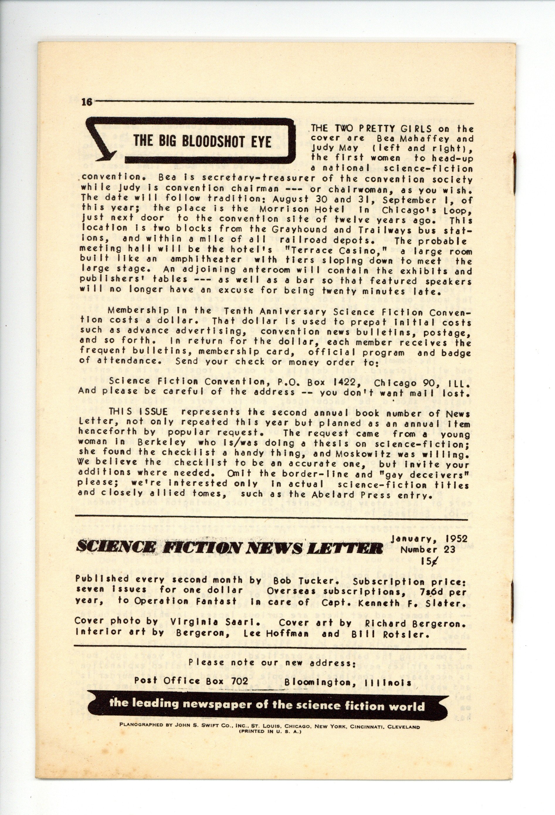 January 1952. Science Fiction Newszine published by Bob Tucker. The first sixteen issues were called the Bloomington Newsletter. 16 pages, B&W. Cover price $0.15.