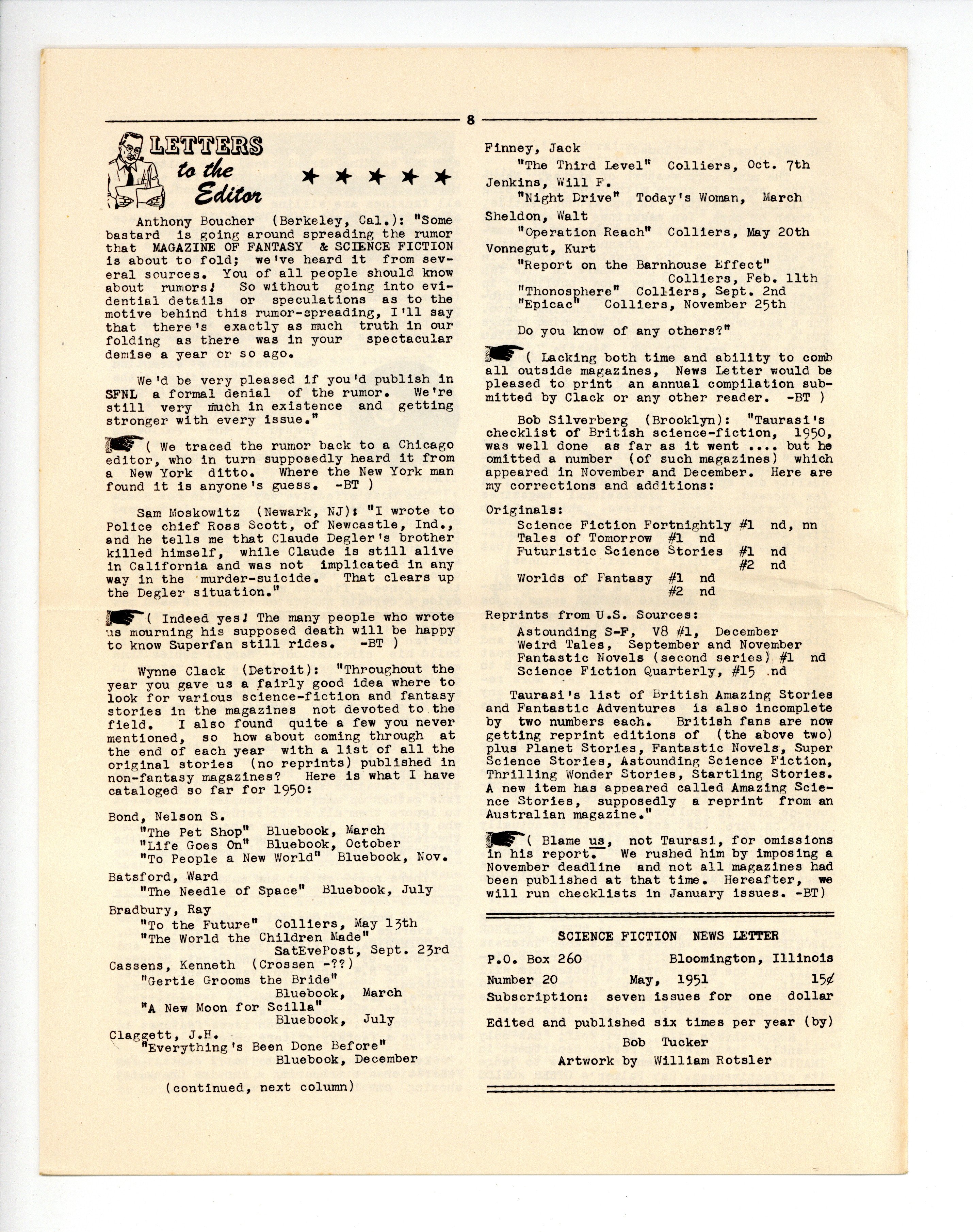 Published May 1951 by Bob Tucker.$8.00May 1951. Science Fiction Newszine published by Bob Tucker. The first sixteen issues were called the Bloomington Newsletter. 16 pages, B&W. Cover price $0.15.