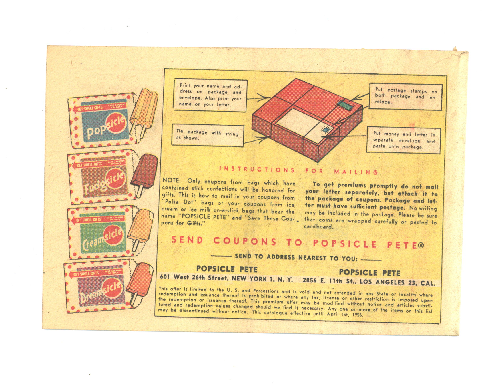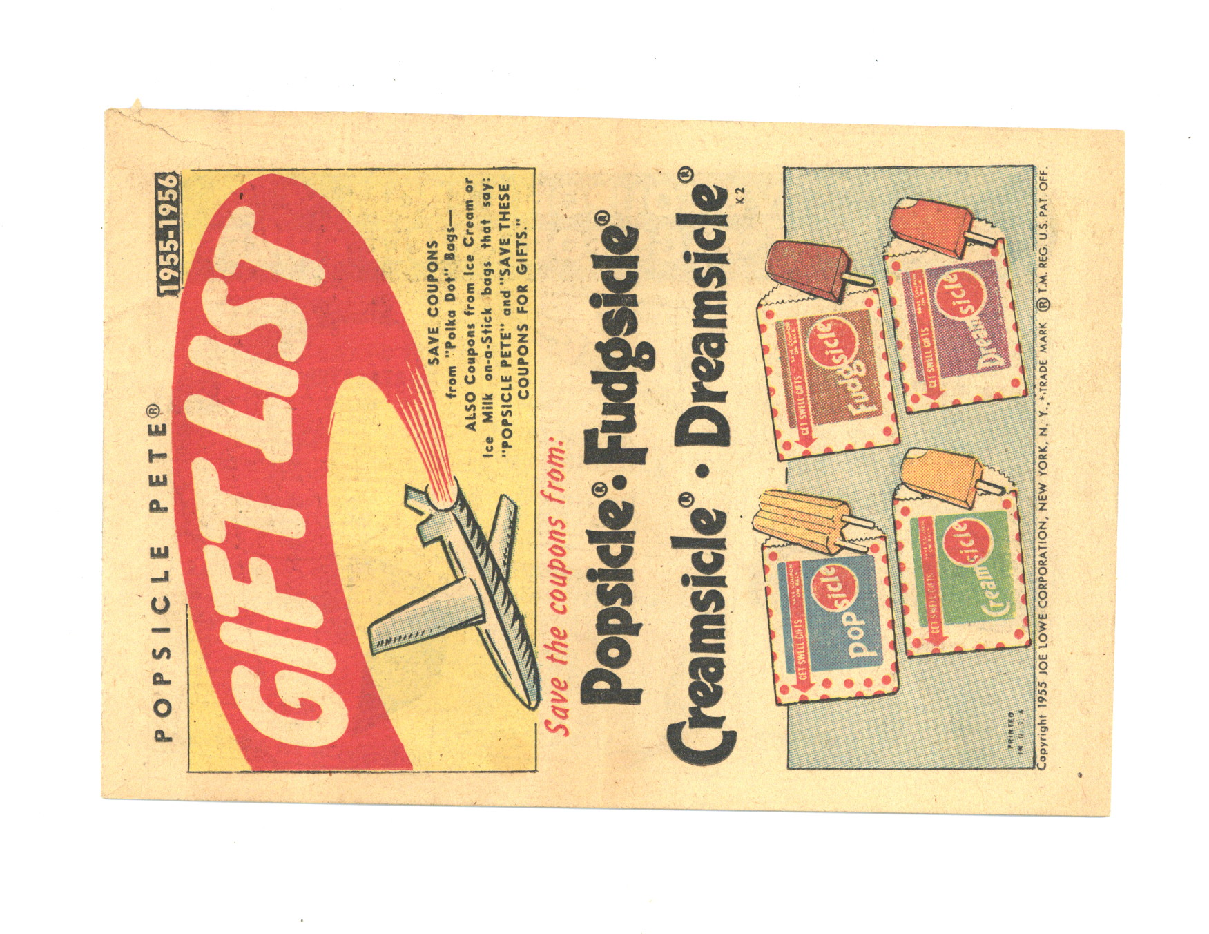 Published 1955 by Joe Lowe Co..$29.00Popsicle Gift List (1955) Featuring Popsicle Pete was a promotional booklet published by the Joe Lowe Corp. This Popsicle Pete booklet was distributed as an advertising giveaway premium at grocery stores. It provides color illustrations of prizes that could be obtained by redeeming coupons from Popsicles, Fudgsicles, Creamsicles and Dreamsicles. Includes baseball gloves, baseballs, footballs, small cap guns, cameras, a pocket knife and other gifts. 8 pages, full color, newsprint, 7.5" x 5".