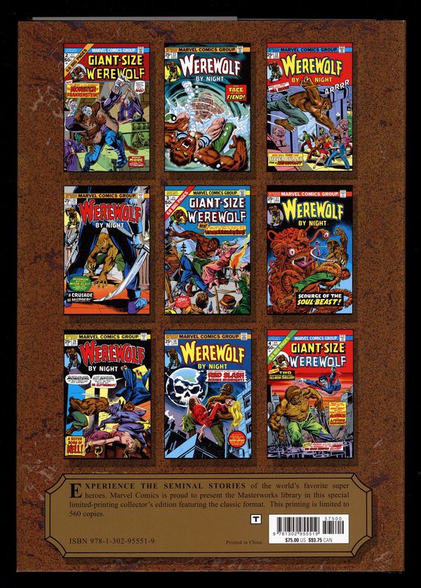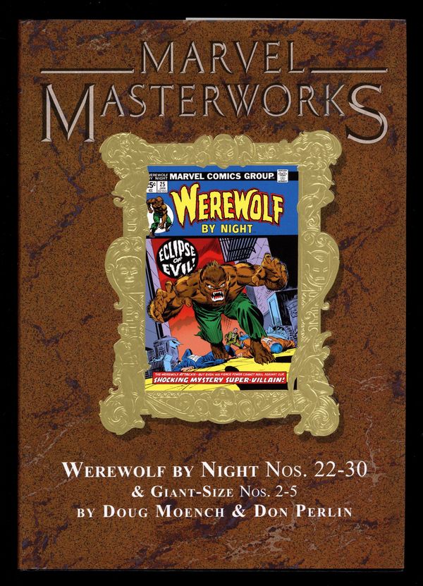 Volume 369 - 1st printing. "Werewolf by Night: Book 3!" Collects Werewolf by Night (1972-1977 1st Series) #22-30 and Giant Size Werewolf (1974) #2-5. Written by Doug Moench. Art by Don Perlin, Virgil Redondo, Yong Montano, Vince Colletta, and Sal Trapani. Cover by Gil Kane and Mike Esposito. Introduction by Doug Moench. Now is the hour to bark at the moon: The third WEREWOLF BY NIGHT Marvel Masterworks is here! This volume goes straight for the good stuff: A battle between the Werewolf and Frankenstein's monster - and another with Morbius! Then Jack Russell is framed for murder. It's going to be hard to find out whether Dr. Redditch's serum can cure Jack of his curse while the LAPD is in pursuit and the Hangman wants to play executioner! Next, dreams of Topaz will bring her together with Jack again as they face a resurrected Taboo and the machinations of Dr. Glitternight! And unfortunately, it runs in the family when Jack's sister Lissa's birthday arrives and the curse of werewolf falls on her too! Hardcover, 328 pages, full color. Rated T Cover price $75.00.