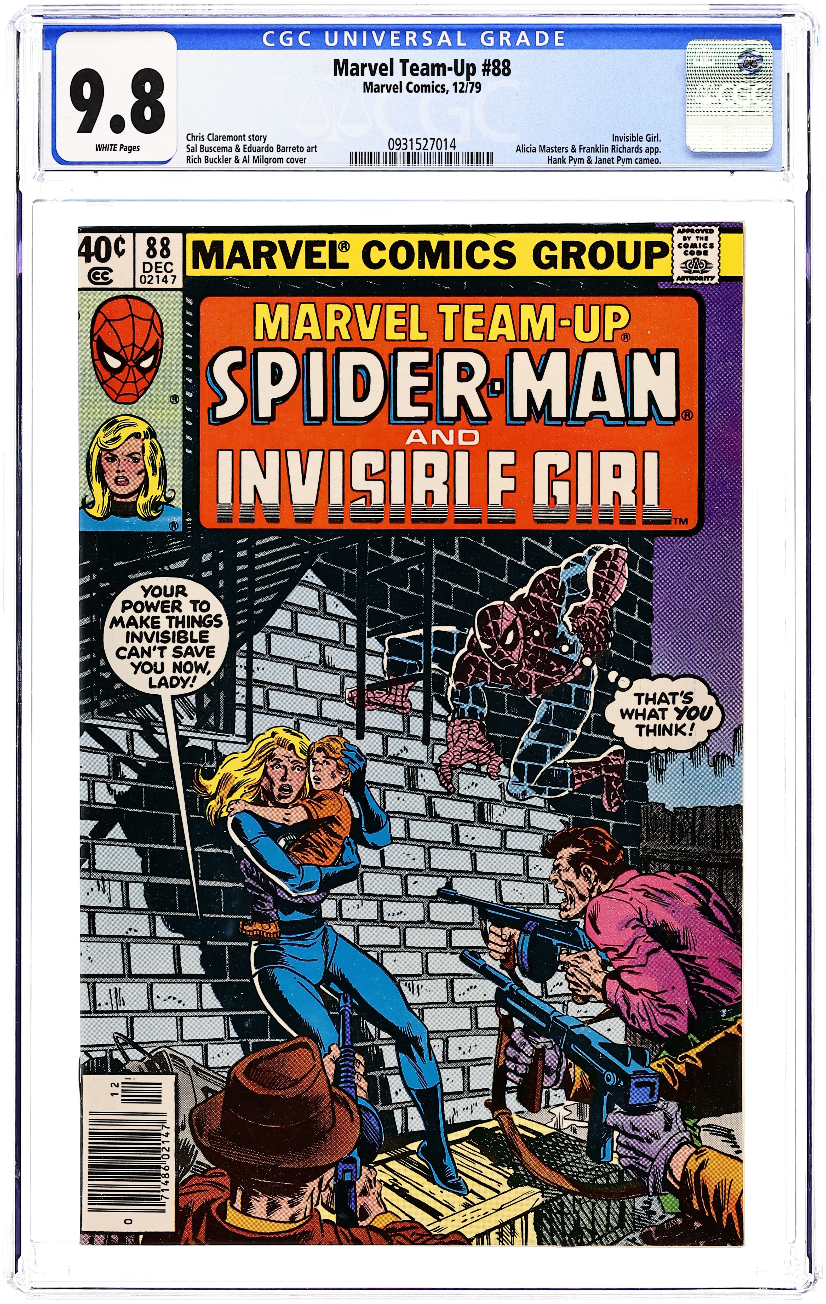 Newsstand Edition. "A Child is Waiting" Guest-starring Spider-Man and the Invisible Girl. Script by Chris Claremont. Art by Sal Buscema (breakdowns) and Eduardo Barreto (finishes). Cover by Rich Buckler and Al Milgrom. Peter Parker and Susan Richards are attending a Central Park society luncheon, when suddenly the Invisible Girl receives a dramatic phone call! Her son Franklin has been kidnapped! And now the abductors, the Maggia, want the female member of the Fantastic Four to do their bidding or else! The Maggia's trail leads first to Harlem and then to the Bronx; but fortunately, Sue picks up an ally along the way...the Amazing Spider-Man! The web-slinger and the Invisible Girl make their last stand in the bowels of the New York subway system! Will the two heroes reach Franklin before it's too late? Cameo appearances by Captain Jean DeWolff, Janet Pym, and Hank Pym. 36 pages. Cover price $0.40.