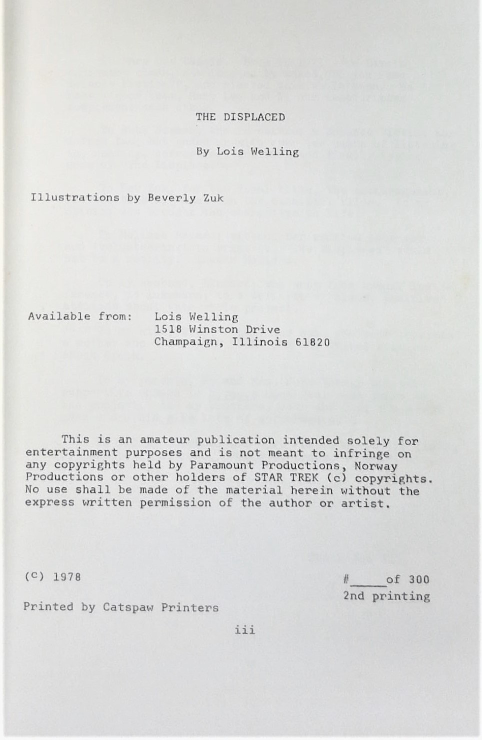 2nd and later printings. Star Trek TOS fanzine novel written by Lois Welling and illustrated by Beverly Zuk. 8.5" x 11", 128 pages, B&W.