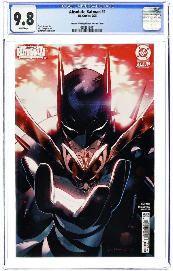 4th Printing. Cvr B. Written by Scott Snyder. Art by Nick Dragotta. Cover by Simone Di Meo. BATMAN LEGEND SCOTT SNYDER AND ICONIC ARTIST NICK DRAGOTTA TRANSFORM THE DARK KNIGHT'S TALE FOR THE MODERN AGE! Without the mansion...without the money...without the butler...what's left is the Absolute Dark Knight! 48 pages, full color. Rated T+ Cover price $5.99.