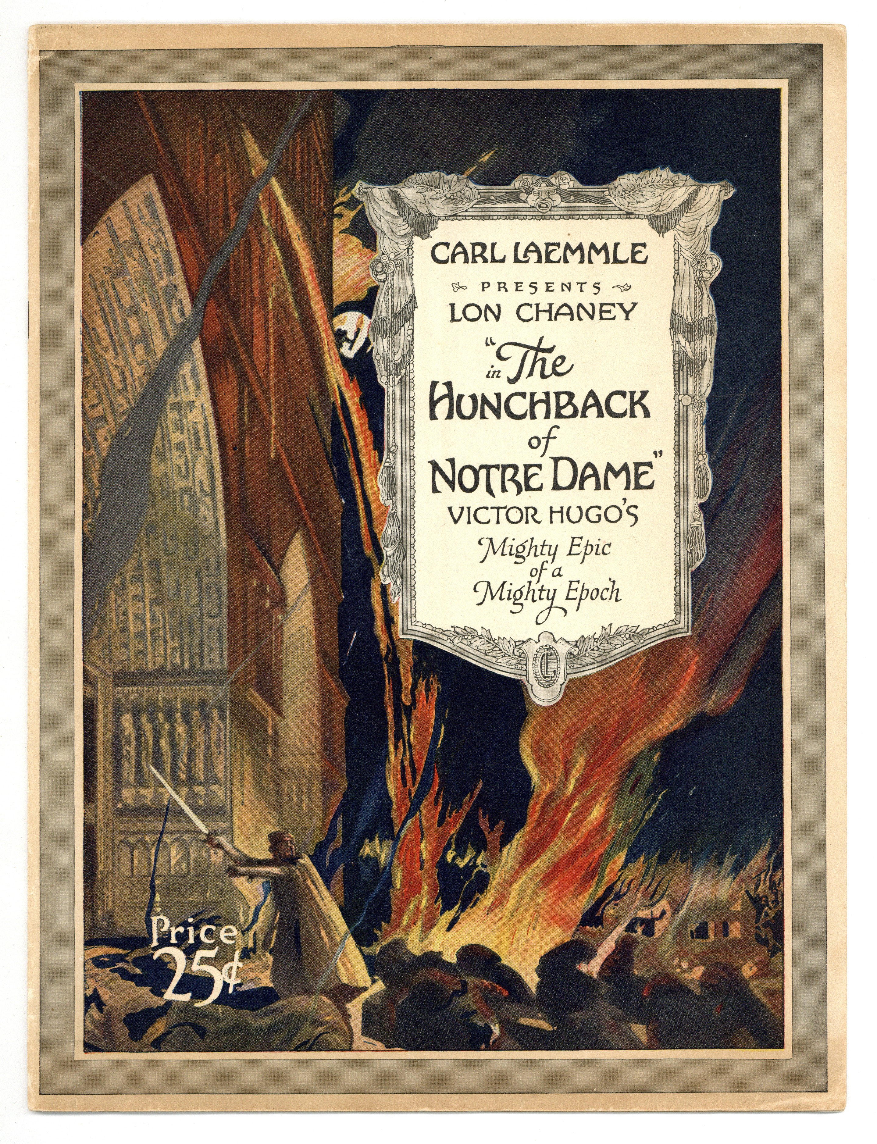 Souvenir Program for the 1923 silent film production of "The Hunchback of Notre Dame" and featuring numerous photos of Lon Chaney in his astounding makeup as Quasimodo. 9" x 12", 20 pages, B&W
