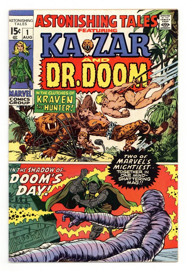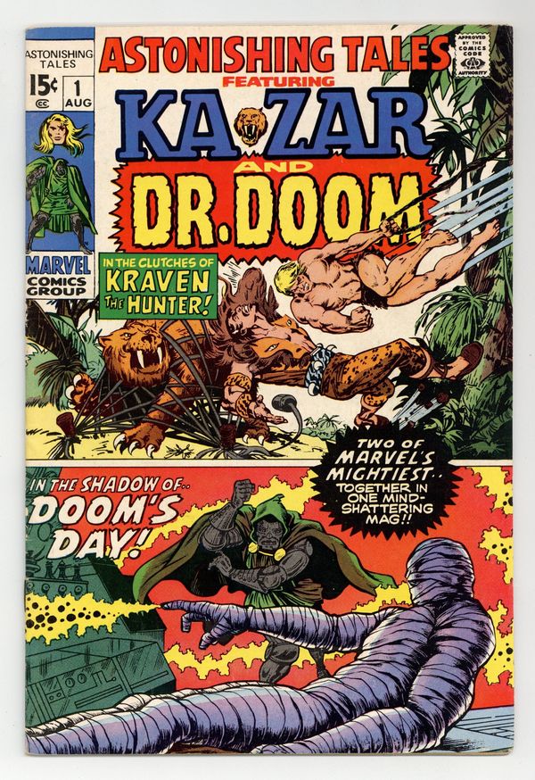 Tags: Doctor Doom$15.75Cover pencils by Marie Severin, inks by Bill Everett. The Power of Ka-Zar!, script by Stan Lee, pencils by Jack Kirby, inks by Sam Grainger; Kraven the Hunter sets his sights on capturing Zabu, knocking out Ka-Zar in the process and then returning to New York with Zabu as his captive; continued from X-MEN #63. Advertisement for the Marvelmania membership kit using a small version of the Poster and Decals that came with the membership. Unto You Is Born... The Doomsman!, script by Roy Thomas, art by Wally Wood; Prince Rudolfo tries to regain the throne of Latveria but Dr. Doom crushes his rebellion. Advertisement reproducing covers for Thor #178 and Captain America #128. Stan Lee's Soapbox. 32 pgs. $0.15. Cover price $0.15.