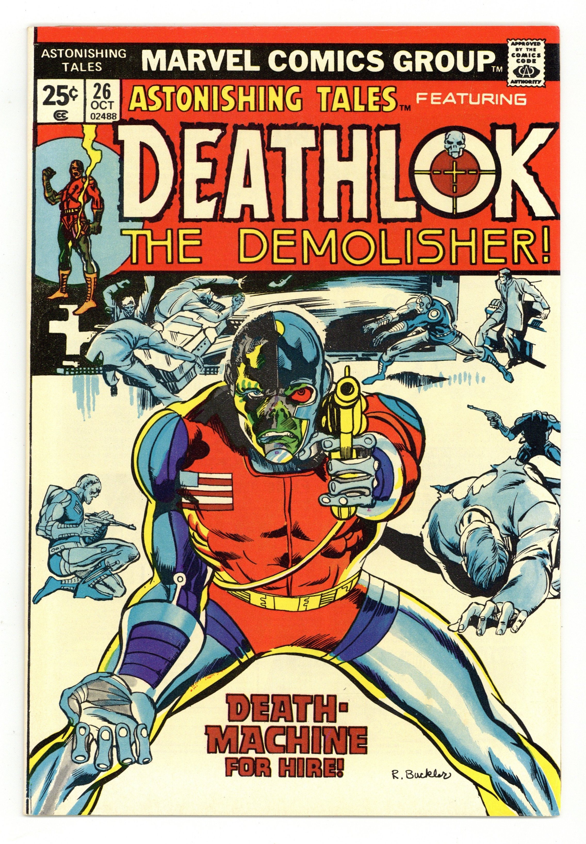 Cover art by Rich Buckler. The Enemy: Us!, script by Rich Buckler (Concept; Plot) and Doug Moench (Plot; Script), pencils by Rich Buckler, inks by Pablo Marcos; Deathlok goes on a mission to rescue Mike Travers (an old army buddy) from Major Simon Ryker; He manages to extract Mike but he is recaptured by Major Ryker's men; When Deathlok goes after Mike again he encounters the War-Wolf, who Major Ryker says is Mike's mind in a cyborg body. Advertisement for 18 Marvel-hero stick-ons from Our Way Studio. Marvel Value Stamp #66 featuring General Ross. Promo for Monsters of the Movies #2. Stan Lee's Soapbox. Promo for Marvel Treasury Edition #1, art by John Romita. 32 pgs. $0.25. Cover price $0.25.