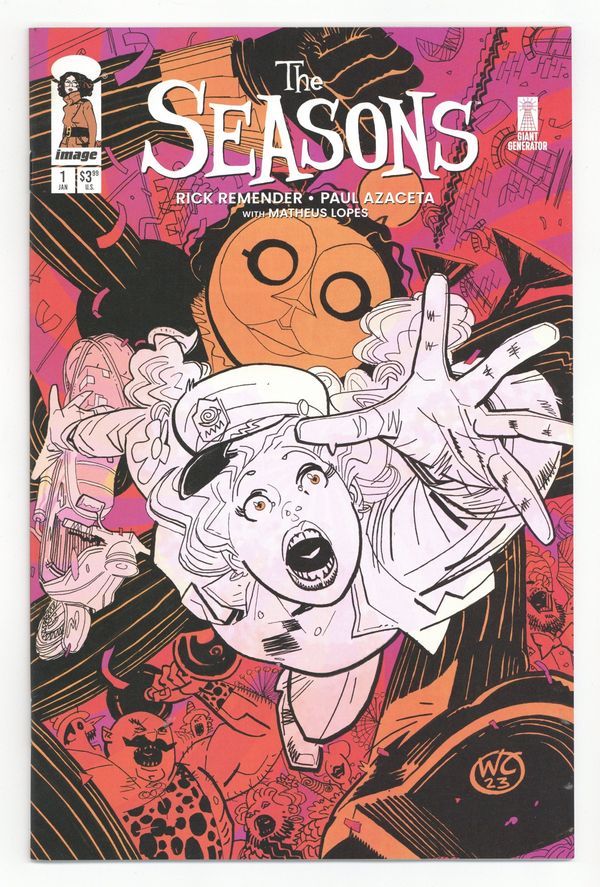 Limited 1 for 50 Retailer Incentive Variant Cover. Written by Rick Remender. Art by Paul Azaceta, Matheus Lopes. Cover by Wes Craig. SERIES PREMIERE In the tradition of Miyazaki and Lynch-perfect for fans of BRUBAKER & MARTÍN's FRIDAY, YOUNG & CORONA's MIDDLEWEST, and TYNION IV & DELL'EDERA's Something Is Killing the Children. Come one, come all, to the amazing new big top show! Your Ringleaders, RICK REMENDER and PAUL AZACETA, invite you to this fantastical double-length premiere issue of their new ongoing series! A decade after the Seasons sisters' beloved parents disappeared, a wicked carnival arrives in town. Within its big tent is a dazzling show led by an eldritch ringleader who offers comers-all a window into their heart's every desire-provided they each leave a piece of themselves behind… Attendees arrive to enjoy the breathtaking entertainment obscured behind its canvas folds-and they leave distracted by the glint of these cursed mirrors. Now it's up to the often-overlooked youngest sister, Spring, to find her missing sisters and put a stop to the Faustian hold the carnival and its cursed mirrors have on its guests. But will she be able to piece her shattered family back together before it's too late for them all? THE SEASONS_ _is a new series brought to life by RICK REMENDER (DEADLY CLASS, GROMMETS) and PAUL AZACETA (OUTCAST BY ROBERT KIRKMAN & **PAUL AZACETA) **that explores themes of fame, obsession, and sisterhood through a dark fairytale lens. 44 pages, full color. Rated T+ Cover price $3.99.