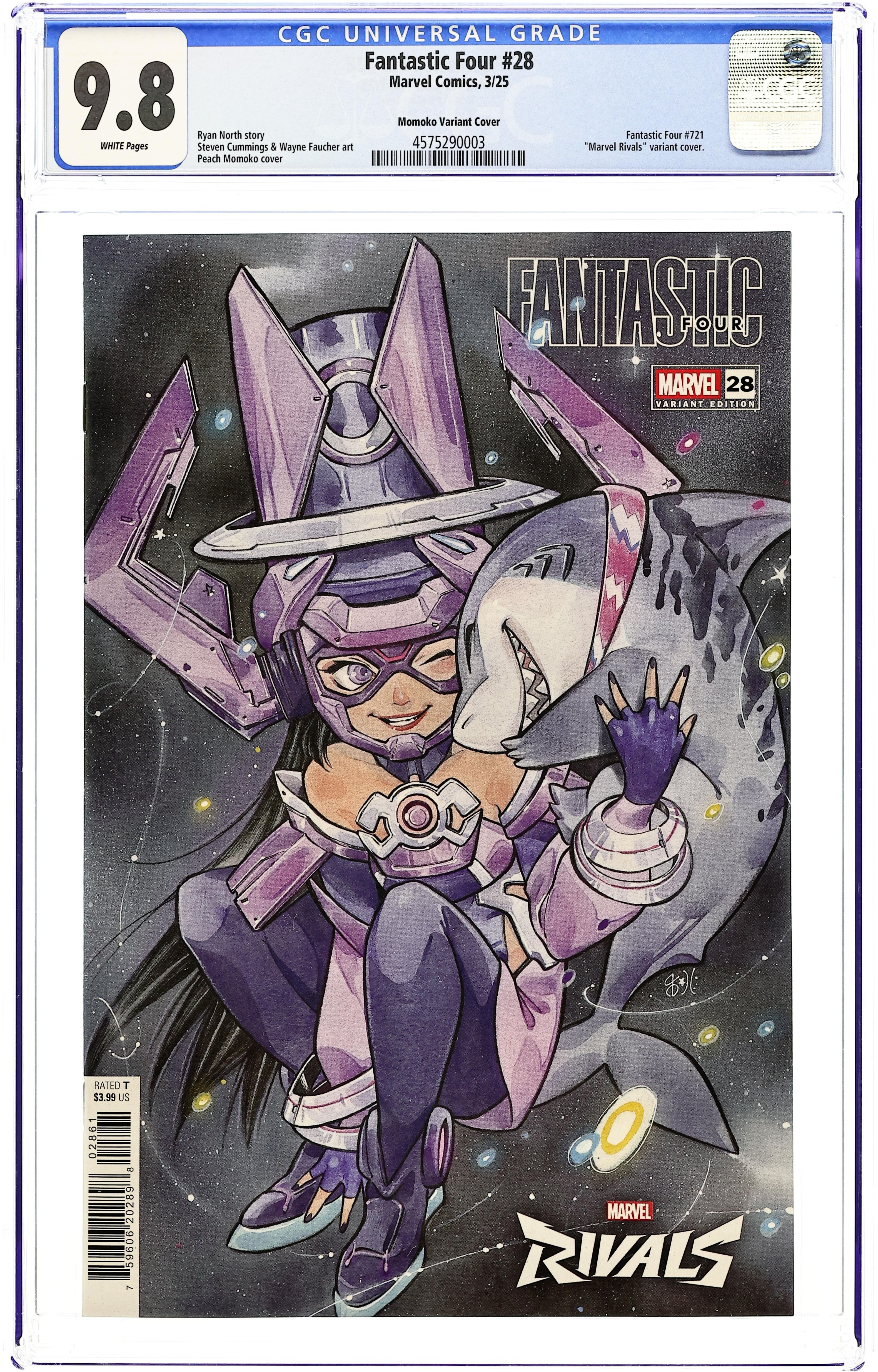 Written by Ryan North. Art by Steven Cummings. Cover by Peach Momoko. PROLOGUE TO ONE WORLD UNDER DOOM! It's been months since Doctor Doom became Sorcerer Supreme - and disappeared. Reed Richards, the smartest man on the planet, has spent that time trying to find a way to understand magic, so he can find and stop Doom...and he's failed. But when Sue suggests there is another man who holds both a graduate degree in physics and an understanding of magic - Dane Whitman, the Black Knight! - Reed and Sue decide to see if he can offer any insights. Dane's help sends Reed and Sue's minds back in time - to possess the bodies of two people in the past, where, without their powers, they search for the one magical item that can cut through Doom's illusions! But the Black Knight has motivations of his own...and the past isn't what it used to be. 28 pages, full color. Rated T Cover price $3.99.