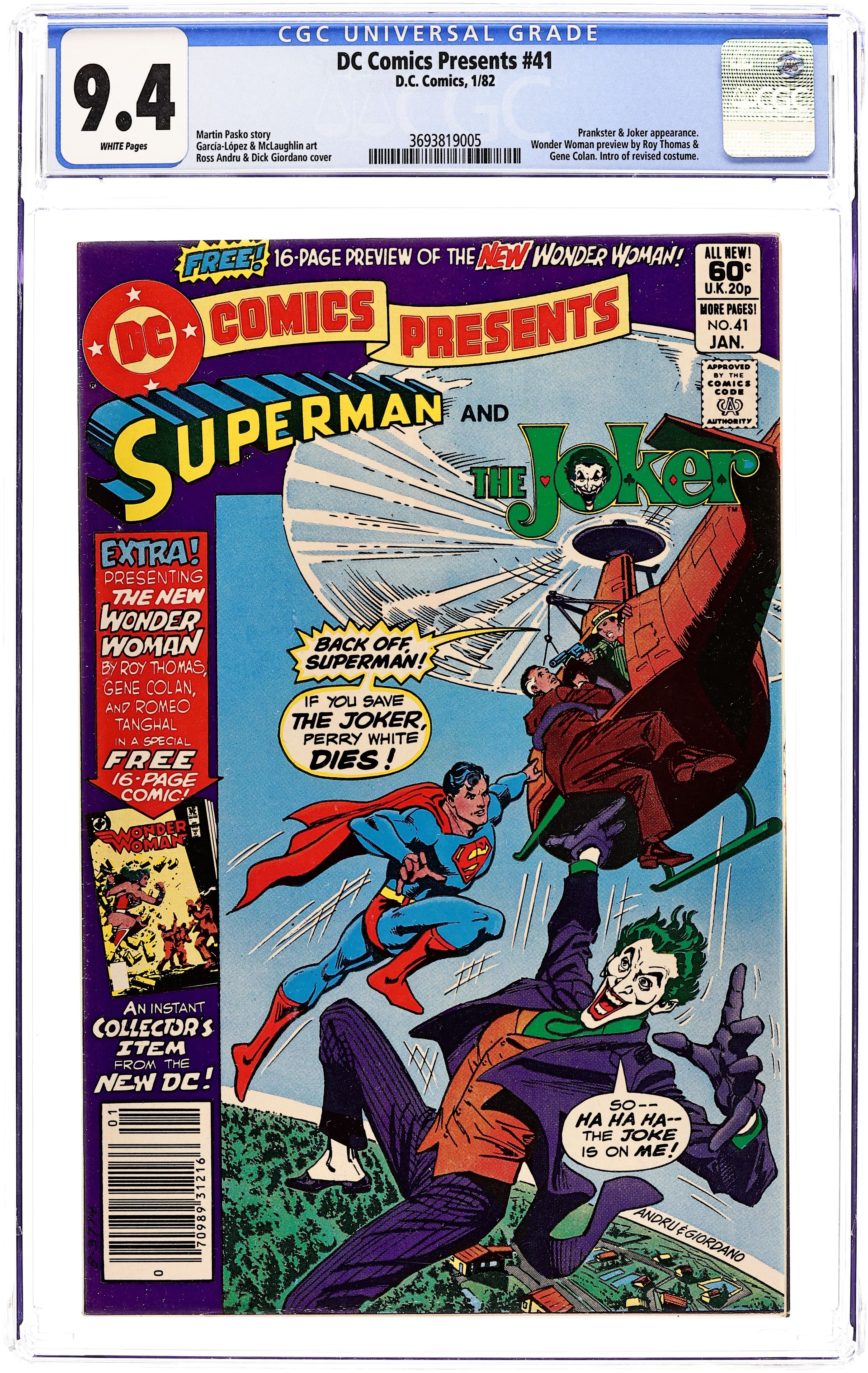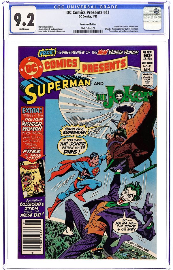 Newsstand Edition. Superman and the Joker team up when the Clown Prince of Crime says he can help find the Prankster and his hostage Perry White in "The Terrible Tinseltown Treasure-Trap Treachery!" Written by Martin Pasko. Art by Jose Luis Garcia-Lopez & Frank McLaughlin. Plus: 16-page new Wonder Woman preview by Roy Thomas, Gene Colan & Romeo Tanghal. Cover by Ross Andru & Dick Giordano. Cover price $0.60.