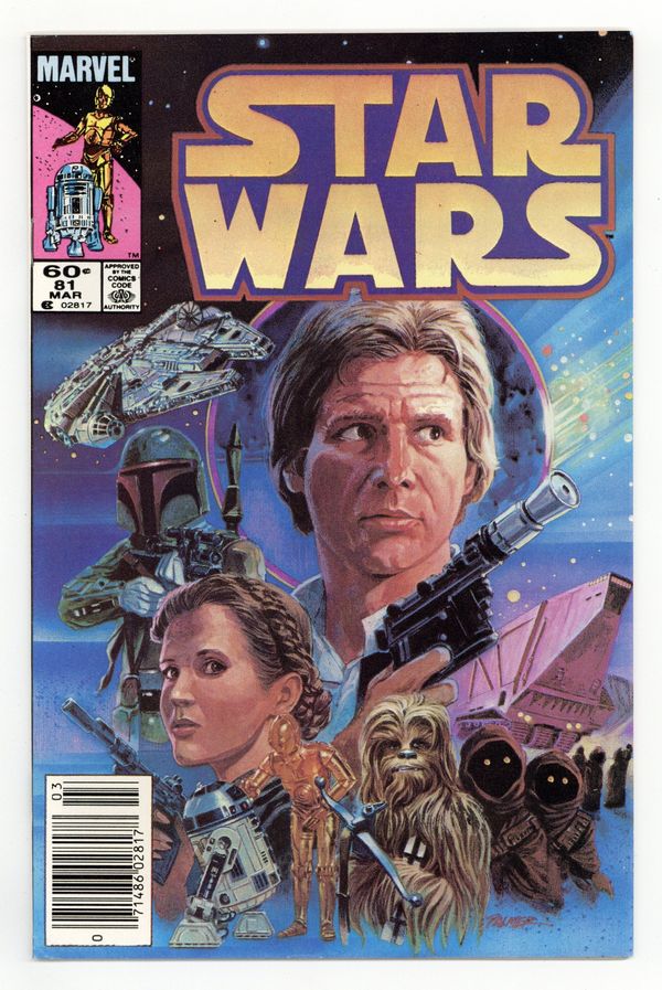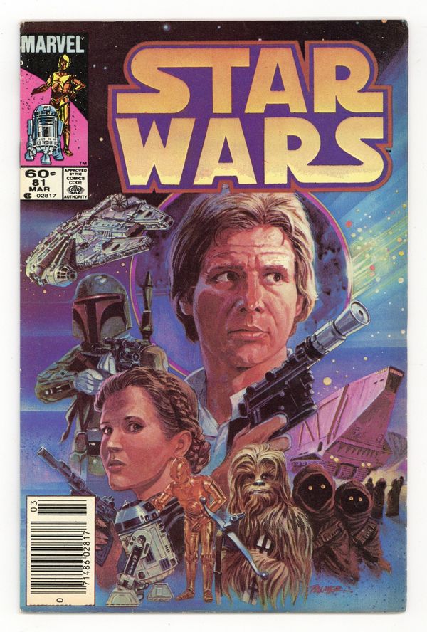 Newsstand Edition. Script by Jo Duffy, breakdowns by Ron Frenz, finishes by Tom Palmer and Tom Mandrake. Cover by Tom Palmer. Han's search for cash brings him, Leia and Artoo to Tatooine, where they encounter an out-from-the-Sarlaac Boba Fett in "Jawas Of Doom". Cover price $0.60.