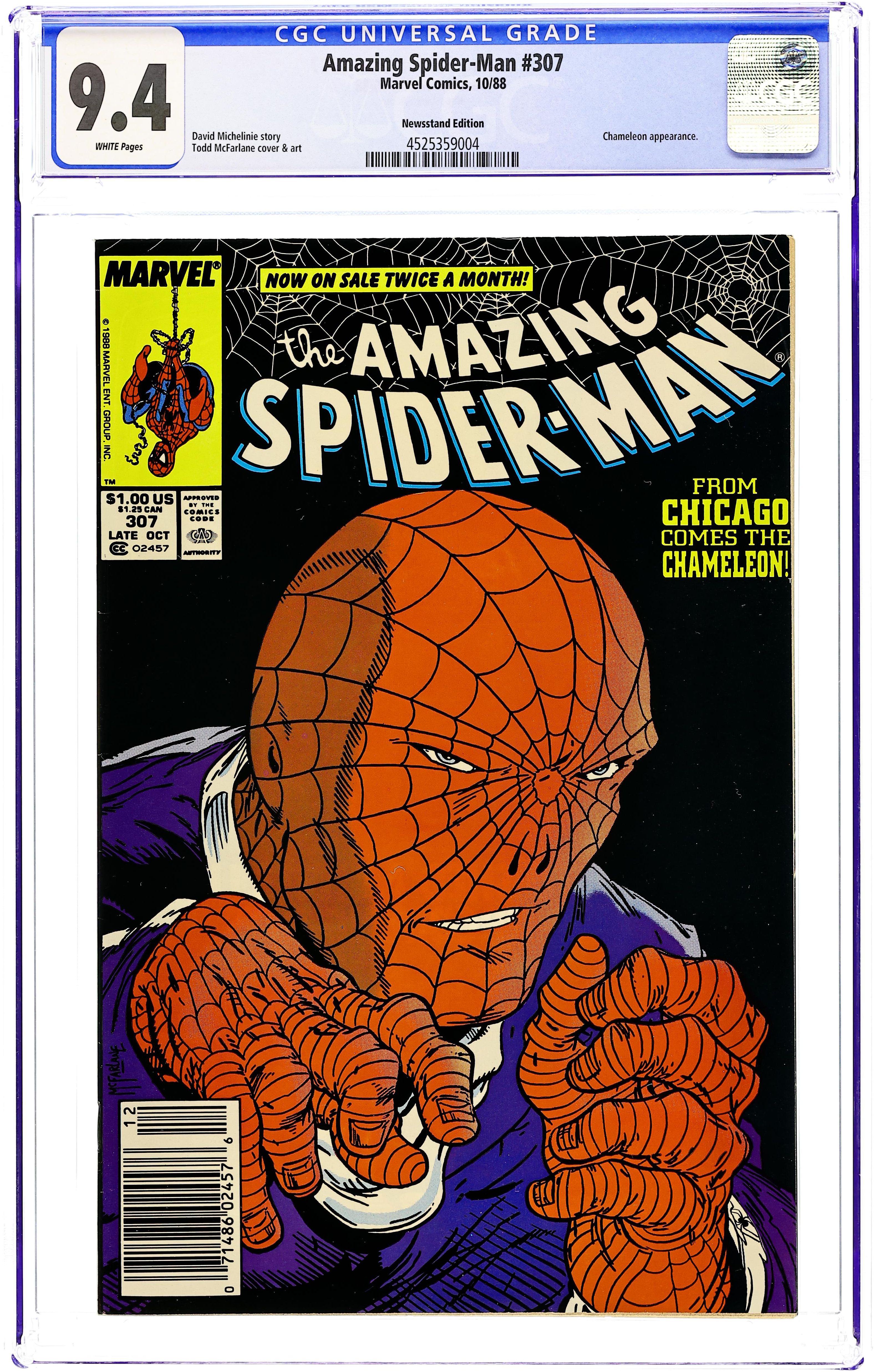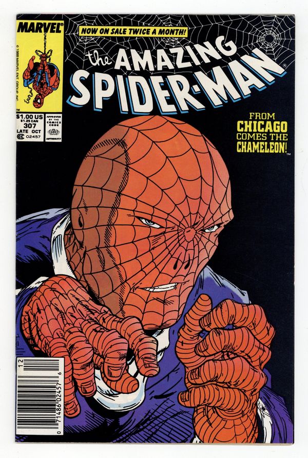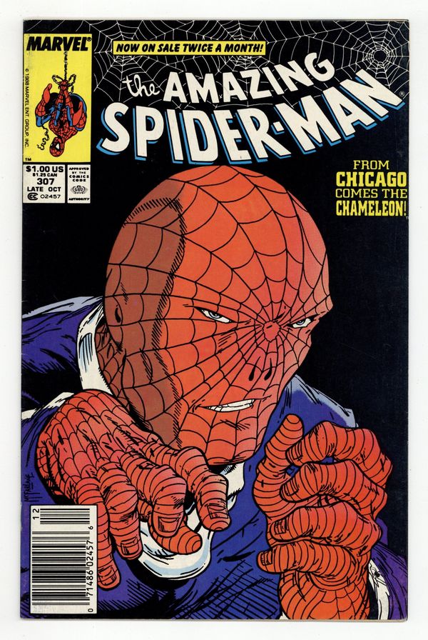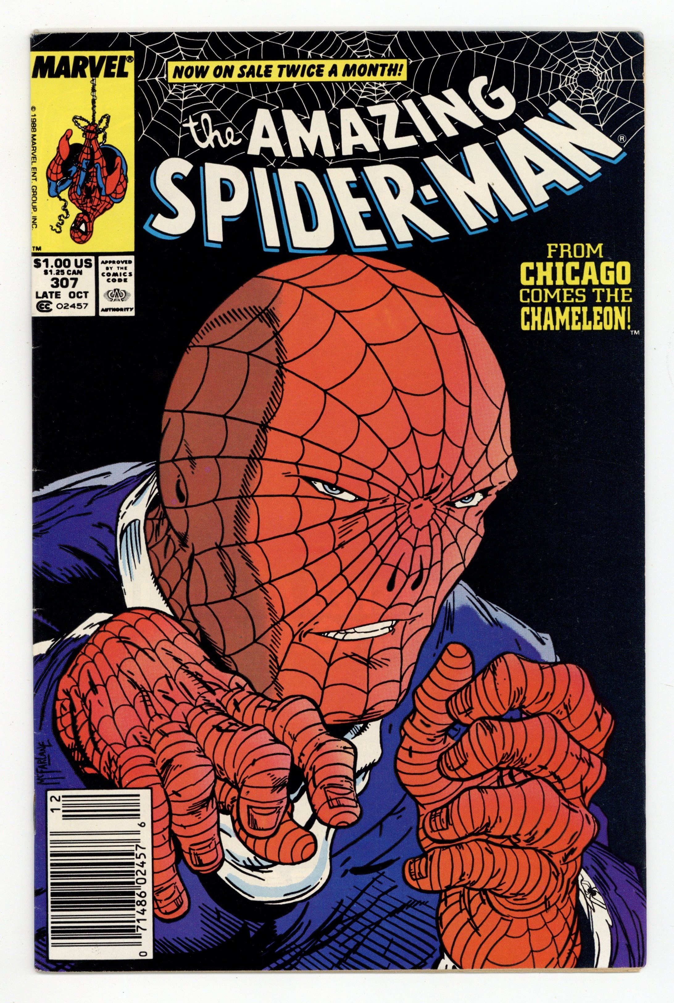 Newsstand Edition. "The Thief Who Stole Himself!" Script by David Michelinie. Art by Todd McFarlane. Cover by Todd McFarlane. Peter Parker's next stop on his book signing tour is the Windy City! This should be a quick and easy trip to Chicago for the web-slinger! However an old foe from long, long ago elects to embark on a new criminal career in the second city! Can the amazing one capture the Chameleon before his next endeavor begins? Spidey will have to spot him first! In the meantime back in Manhattan, the deranged Jonathan Caesar makes his move on Mary Jane! Hurry home Spider-Man! (Note: The Chameleon previously battled the wall-crawler in Amazing Spider-Man 186.) 36 pages. Cover price $1.00.
