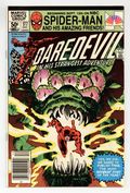 Newsstand Edition. Last 50-cent issue. Cover pencils by Frank Miller, inks by Klaus Janson. Where Angels Fear To Tread, script by Frank Miller, pencils by Frank Miller (breakdowns) and Klaus Janson (finished art), inks by Klaus Janson; Stick helps his old pupil face his demons and regain his radar sense; The Bugle publishes an expose on Kingpin's candidate for Mayor of New York; Elektra is brought to Kingpin's attention; Daredevil origin retold; Jonah Jameson appearance; cameo by the Hand. 36 pgs. Cover price $0.50. Cover price $0.50.
