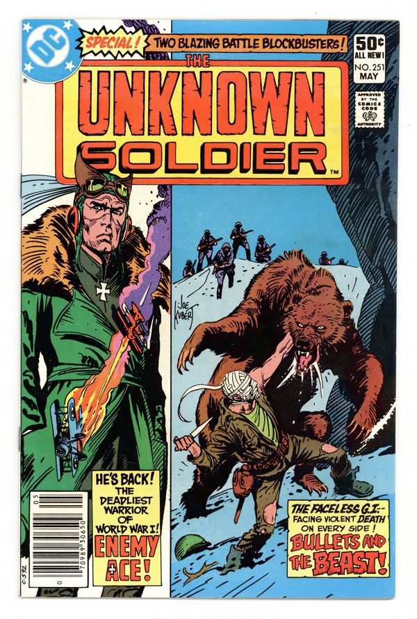 $25.50Newsstand Edition. Cover by Joe Kubert. Thou Shalt Not Kill!, script by Bob Haney, pencils by Dick Ayers, inks by Gerry Talaoc; The Unknown Soldier and a monk travel to Germany to find a traitor. I, The Executioner [Hell in the Heavens Part One], script by Robert Kanigher, art by John Severin; The Enemy Ace must carry out the dying wish of a British pilot. Eternal Sentinel, script by Robert Kanigher, art by Tenny Henson; WWII Pacific Airforce story. 36 pgs., full color. $0.50. Cover price $0.50.