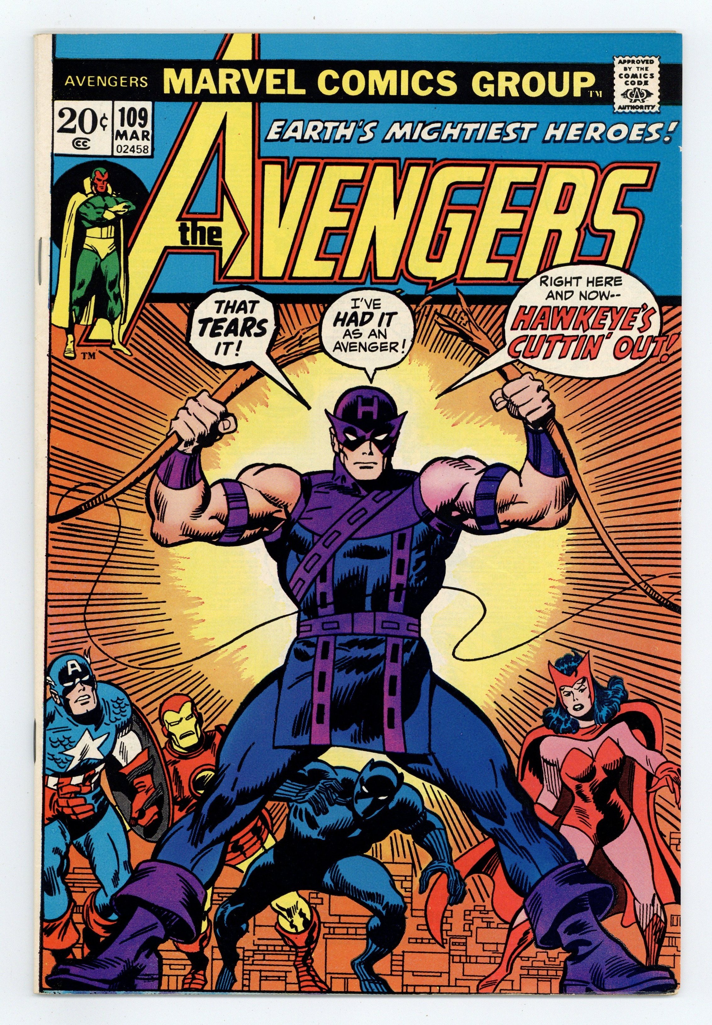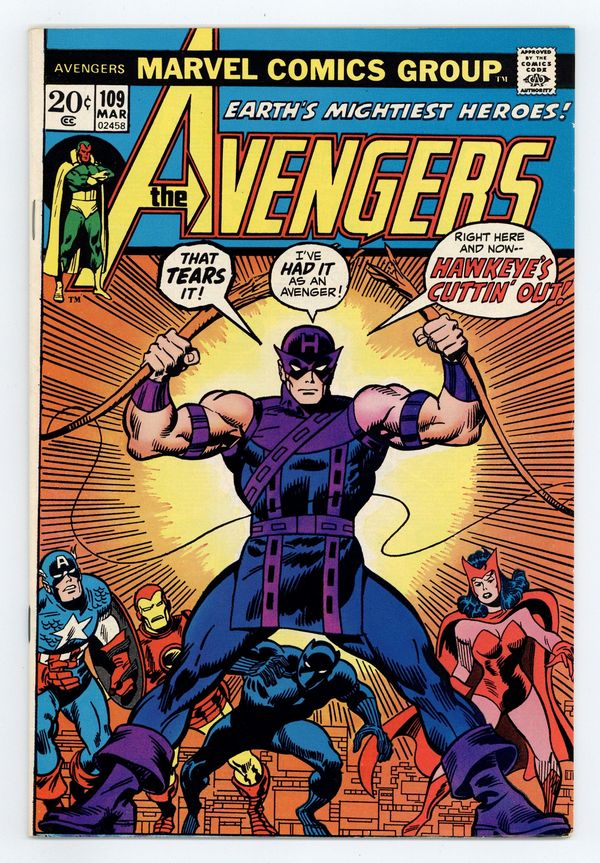 Tags: Marvel Legacy Numbering: Avengers (part 109), Avengers$18.75"The Measure of a Man!" Script by Steve Englehart. Pencils by Don Heck. Inks by Frank McLaughlin. Cover by John Buscema and Sal Buscema. Hawkeye feels restless in his current stint with the Avengers, because the Scarlet Witch has declared her affection for the Vision. The ace archer decides to leave the Fifth Avenue mansion, and shortly thereafter bumps into a man called Champion. He's a 9-foot-tall multi-millionaire that wants Clint Barton to teach him the sport of archery! Hawkeye agrees and the duo departs for California to begin training. Everything with the archery instruction is going smoothly, but perhaps a little too smoothly! Especially when Hawkeye discovers Champion's diabolical plot to bomb the San Andreas Fault! Fortunately though, the remaining avengers decide to check up on their teammate...and just in the nick of time! Earth's Mightiest Heroes clash on the coast to dethrone the Champion! Avengers Lineup: Black Panther, Hawkeye, Iron Man, Scarlet Witch, Thor, and the Vision. (Notes: Champion returns many years later in Marvel Comics Presents 125. The letters page contains a statement of ownership: average print run 349,793; average paid circulation 189,961.) 36 pages Cover price $0.20.