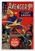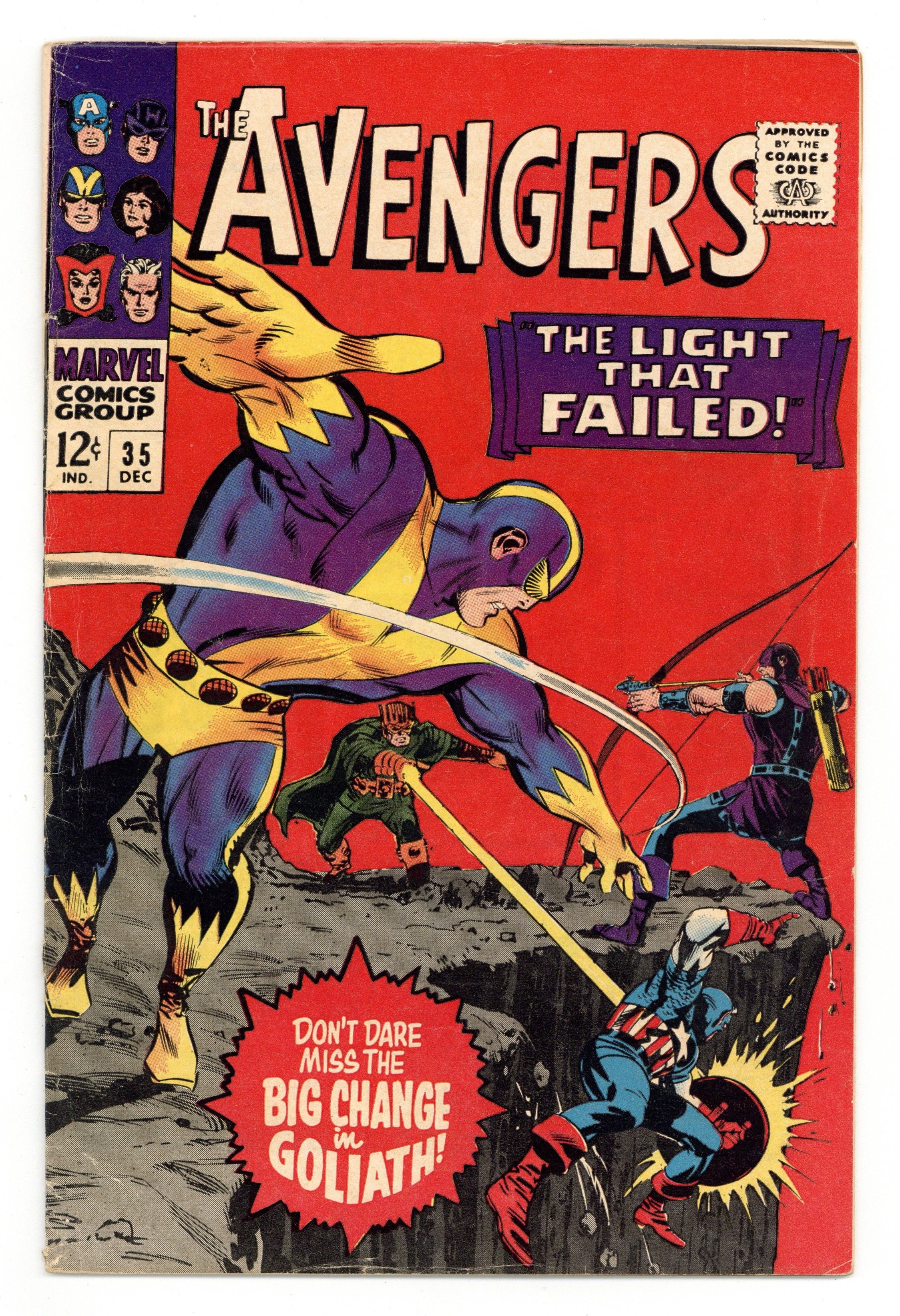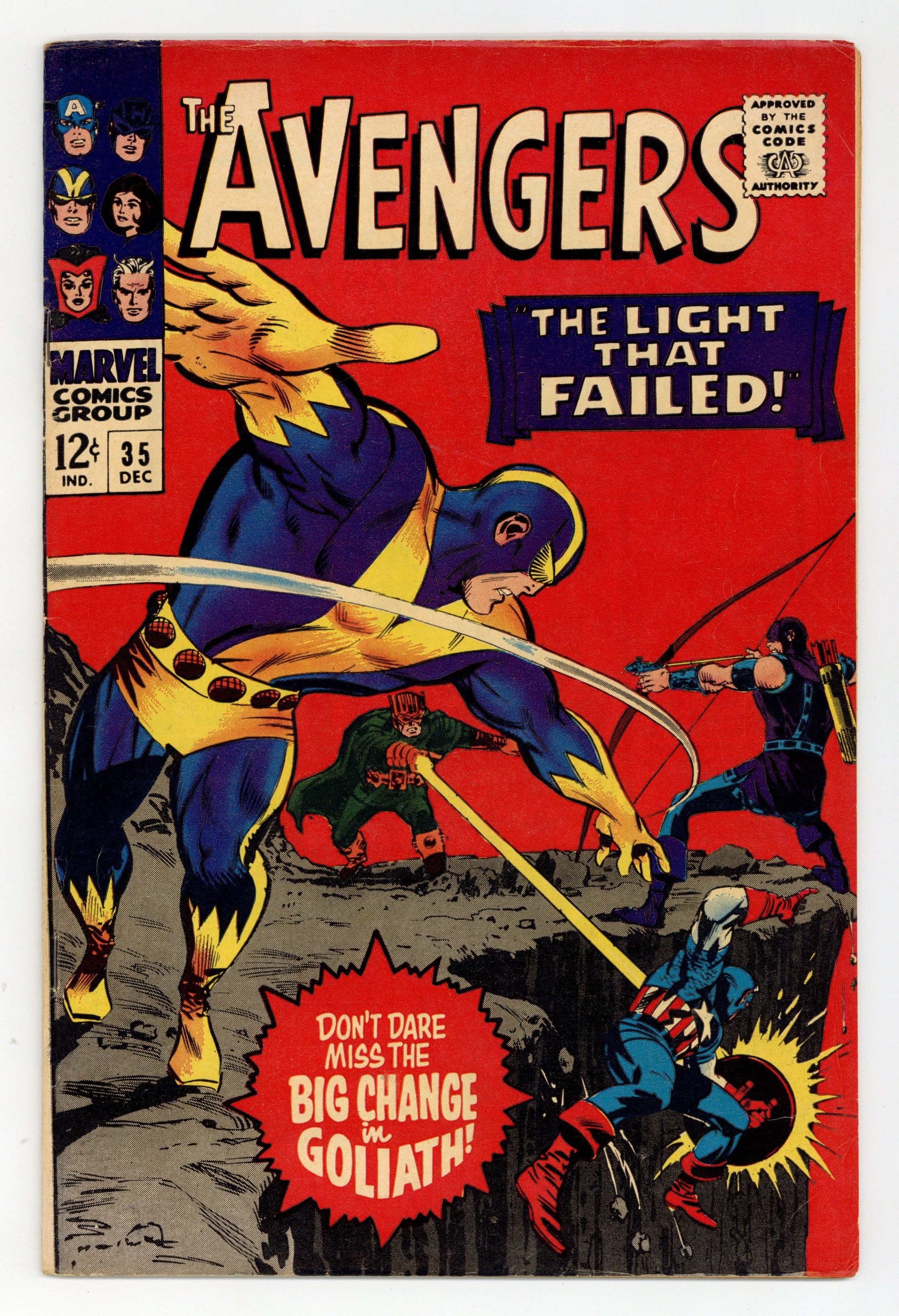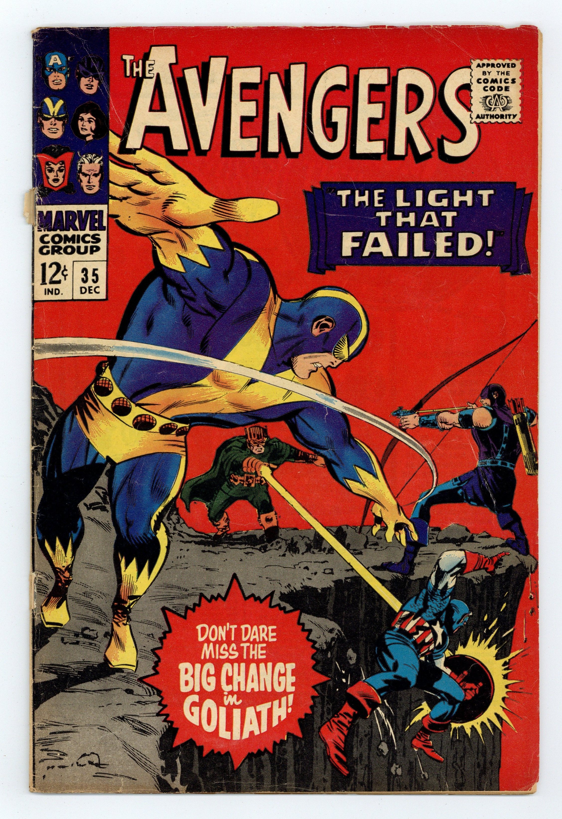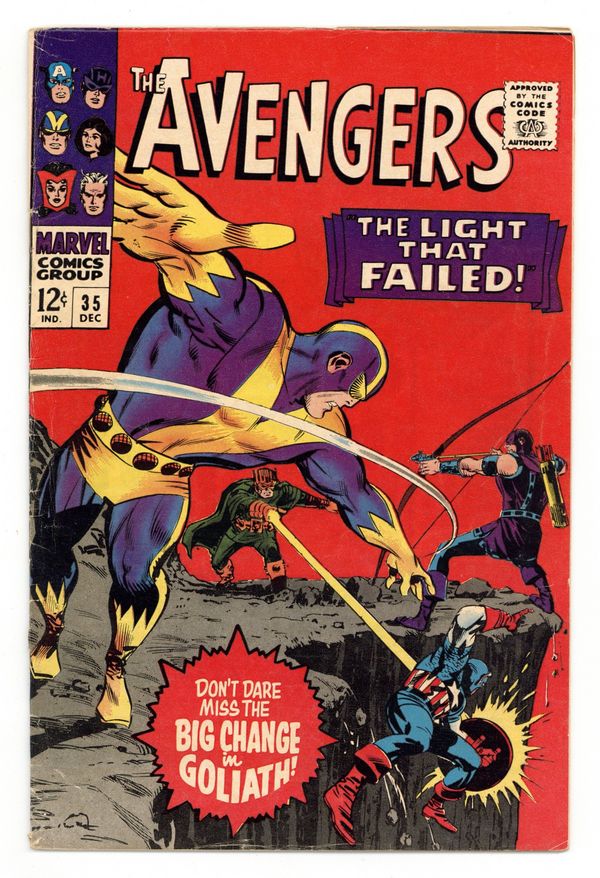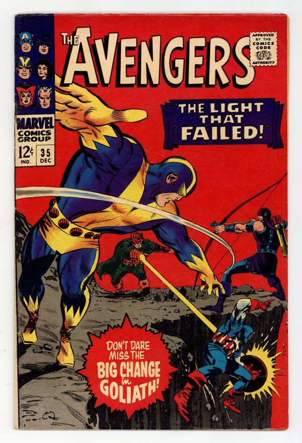 Tags: Marvel Legacy Numbering: Avengers (part 35), Avengers$21.00"The Light That Failed!" Part 2 of 2. Plot by Stan Lee and Roy Thomas. Script by Roy Thomas. Art by Don Heck. Cover by Don Heck. The Living Laser has emerged triumphant from his battle against Earth's Mightiest Heroes. And now with the winsome Wasp as his prisoner, the laser-focused villain moves on to his next endeavor! Strangely enough...and for several million dollars, Arthur Parks is going to help overthrow the government of Costa Verde -- a country in Central America. However news of the Living Laser's involvement in Costa Verde's civil war reaches Avengers Mansion! So Cap, Hawkeye, and Goliath know where to find him! When the Avengers arrive south of the border, the non-stop action starts! The Living Laser and his new laser cannon are very formidable. Thus it will take a dangerous gamble by Hank Pym to save the day! Go to the ants! Cameo appearances by Dr. Bill Foster and the Black Widow. (Notes: Jack Kirby and Frank Giacoia contributed the drawing of Captain America to the cover. This issue begins Roy Thomas' five-and-a-half-year run as the writer of the Avengers title. The letters page includes a letter from comics artist Dave Cockrum. This story was reprinted in Marvel Triple Action #27.) 36 pages. Cover price $0.12.