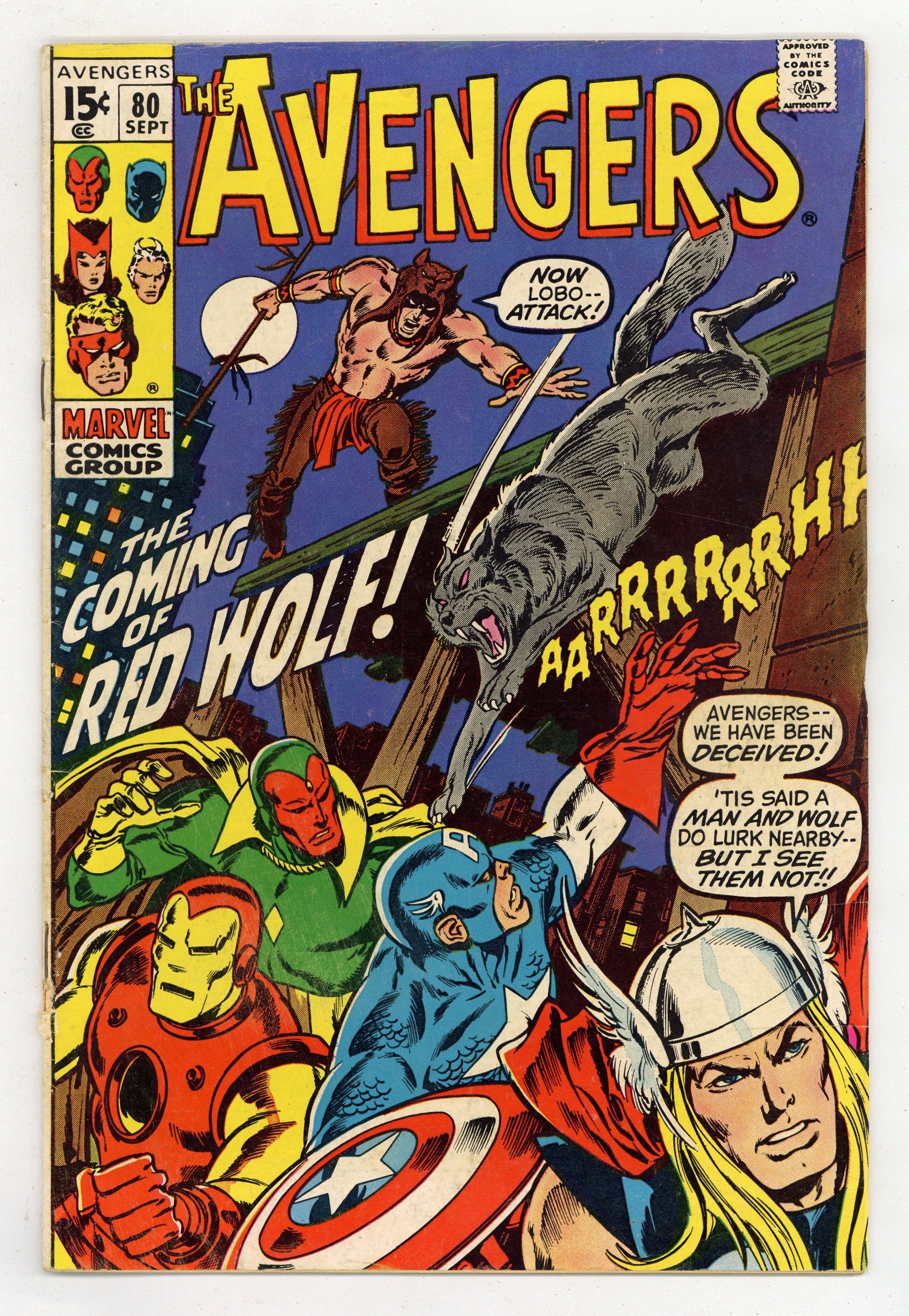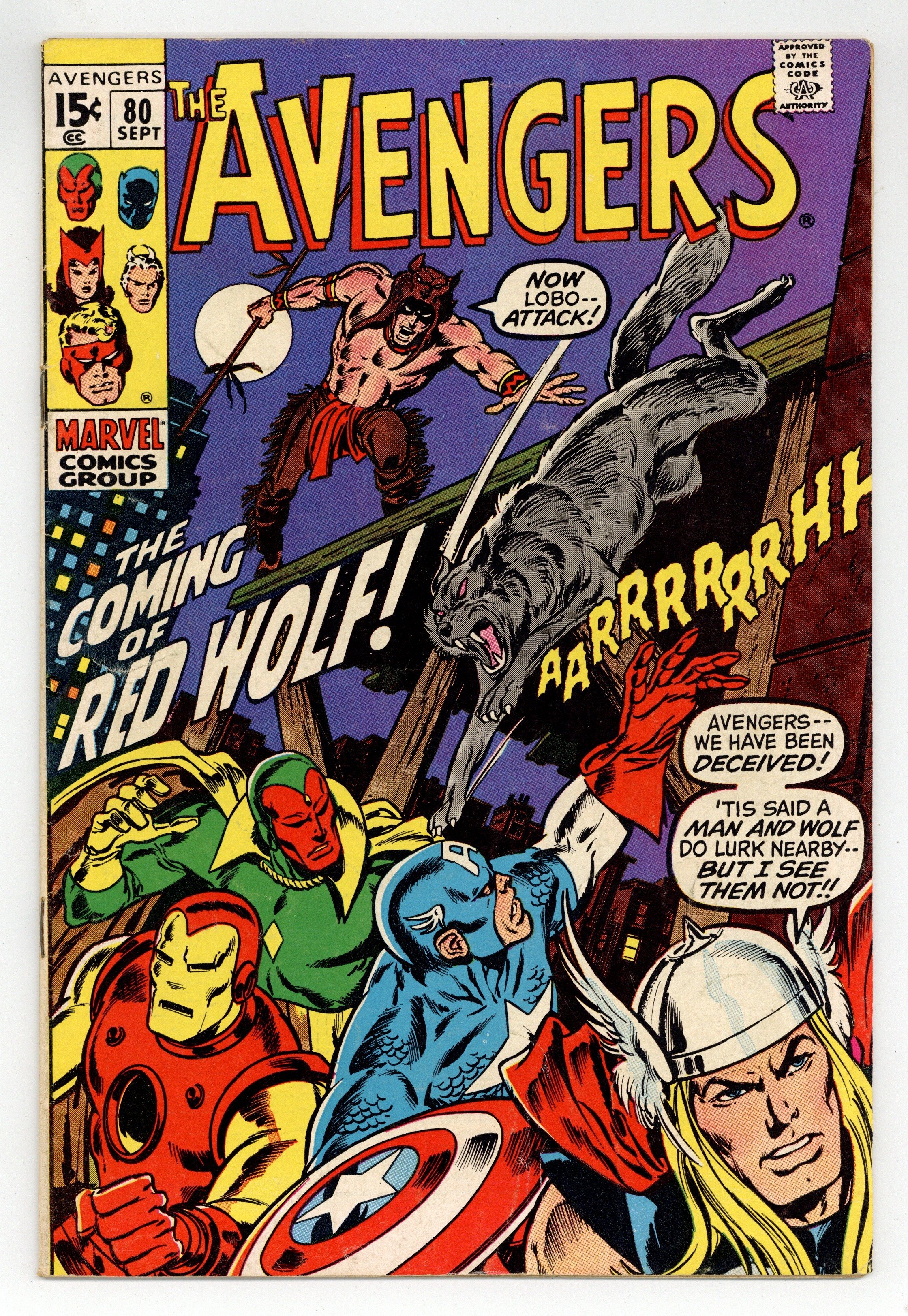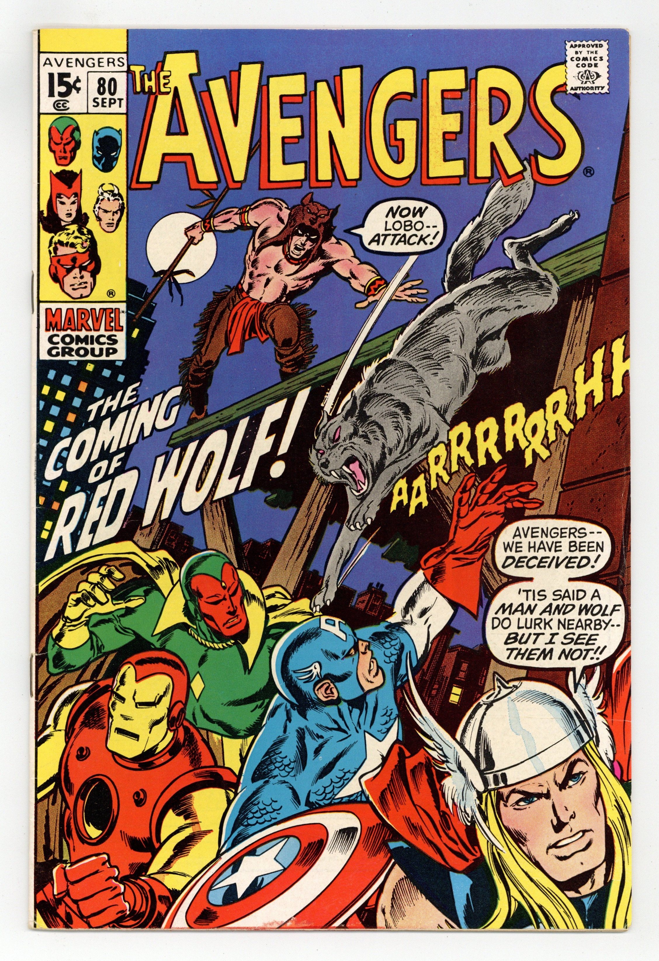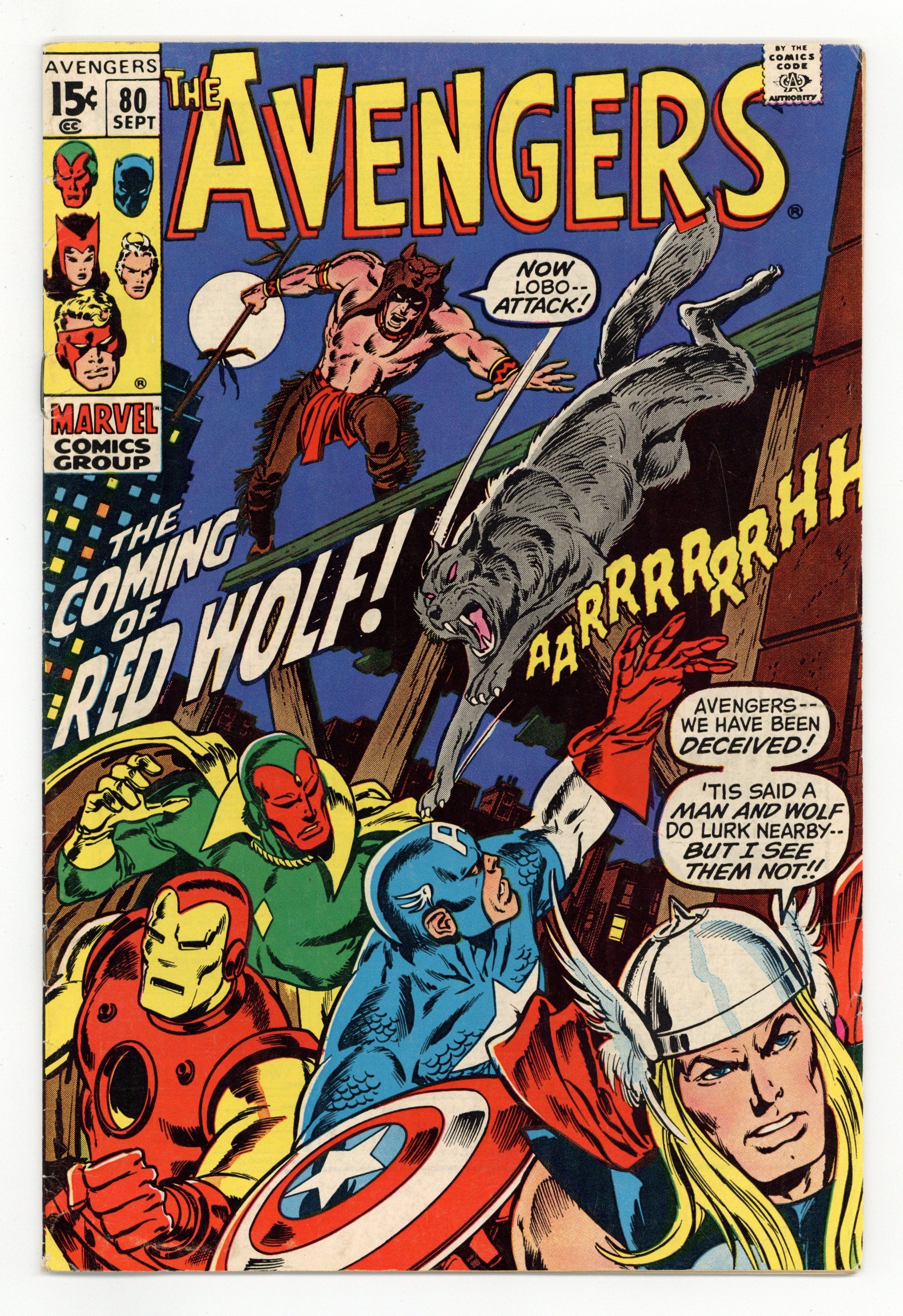 "The Coming of Red Wolf!" Part 1 of 3. First appearance of Red Wolf. Script by Roy Thomas. Pencils by John Buscema. Inks by Tom Palmer. Cover by John Buscema and Tom Palmer. During an evening walk through Manhattan, the Vision encounters a man and a wolf! But this isn't just any human and canine duo, it's the newest Marvel superhero Red Wolf, and his faithful partner Lobo! After a brief skirmish, the synthezoid avenger takes Red Wolf to Avengers Mansion to learn why the native American warrior has traveled so far from home. And regrettably the reason is a name Earth's Mightiest Heroes know very well: Cornelius Van Lunt! The ruthless businessman is using extortion to take land from Red Wolf's tribe! So the Avengers will be departing for big sky country very soon, right? Not so fast! Because the golden avenger has identified an urgent threat in the city: the resurgent Zodiac! Will the Avengers divide and conquer both menaces? Origin of Red Wolf. Avengers Lineup: Black Panther, Captain America, Goliath, Iron Man, Quicksilver, Scarlet Witch, Thor, and the Vision. (Note: The letters page includes a full-page reply by Roy Thomas to a controversial fan letter (printed in Avengers 79) about the story in Avengers 73 & 74.) 36 pages. Cover price $0.15.