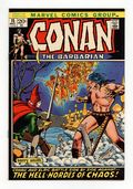 Cover art by Barry Windsor-Smith. Elric guest-stars in The Green Empress of Melnibone, plot by Michael Moorcock and James Cawthorn, script by Roy Thomas, pencils by Barry Windsor-Smith, inks by Sal Buscema; Conan and Elric have an un-easy truce while they ride to the sunken city known as Yagala; Once there they have to face Xiombarg, Prince Gaynor the Damned, Kulan-Gath and Terhali; When their combined power is not enough to defeat them Arkyn must join the fight to help them. Letter to the editor from artist William Stout. 36 pgs. Cover price $0.20.