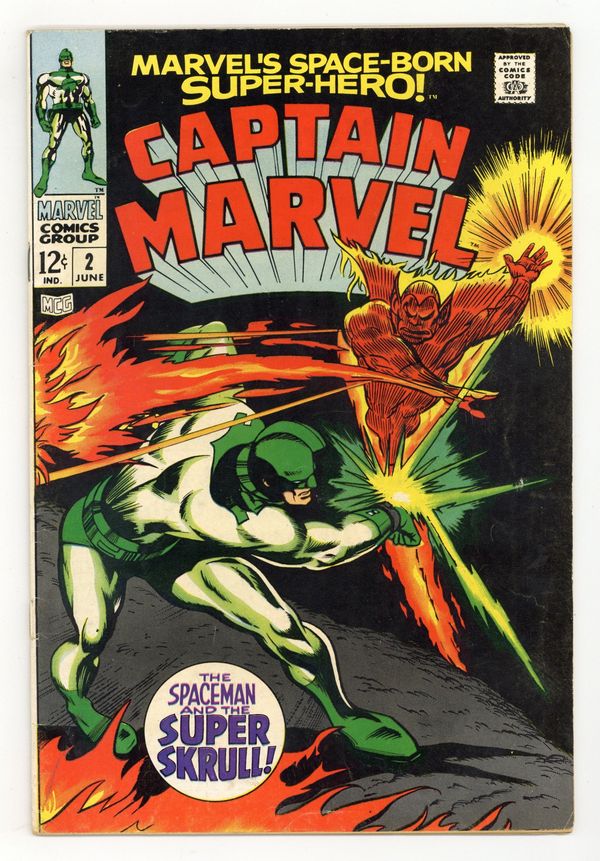 Cover pencils by Gene Colan, inks by Vince Colletta. "From The Void Of Space Comes," script by Roy Thomas, pencils by Gene Colan, inks by Vince Colletta; Skrull emperor Dorrek VII has become aware of recent activity on Earth involving the Skrull's age old enemies the Kree, most notably the recent activation of the Kree Sentry; Seeking to find out the truth of the Kree's involvement on Earth, Dorrek calls the Super-Skrull back to the Skrull home world from his exile after his last defeat at the hands of the Fantastic Four; The Super-Skrull is ordered to find out what their enemies are up to, and kill Mar-Vell; The reward for success would be anything the Super-Skrull desired; Wanting to be married to the emperors daughter Anelle, the Super-Skrull accepts the mission and returns to Earth; There, Mar-Vell has just returned from his battle against the Sentry to find that his carrying bag has been stolen from his room. Suspecting the owner of the hotel, and fearing that tampering may have activated the self-destruct mechanism on it, Mar-Vell rushes out to find the hotel owner; The owner himself is on his way to the Cape with to turn over to the military there. 36 pgs., full color. Cover price $0.12.