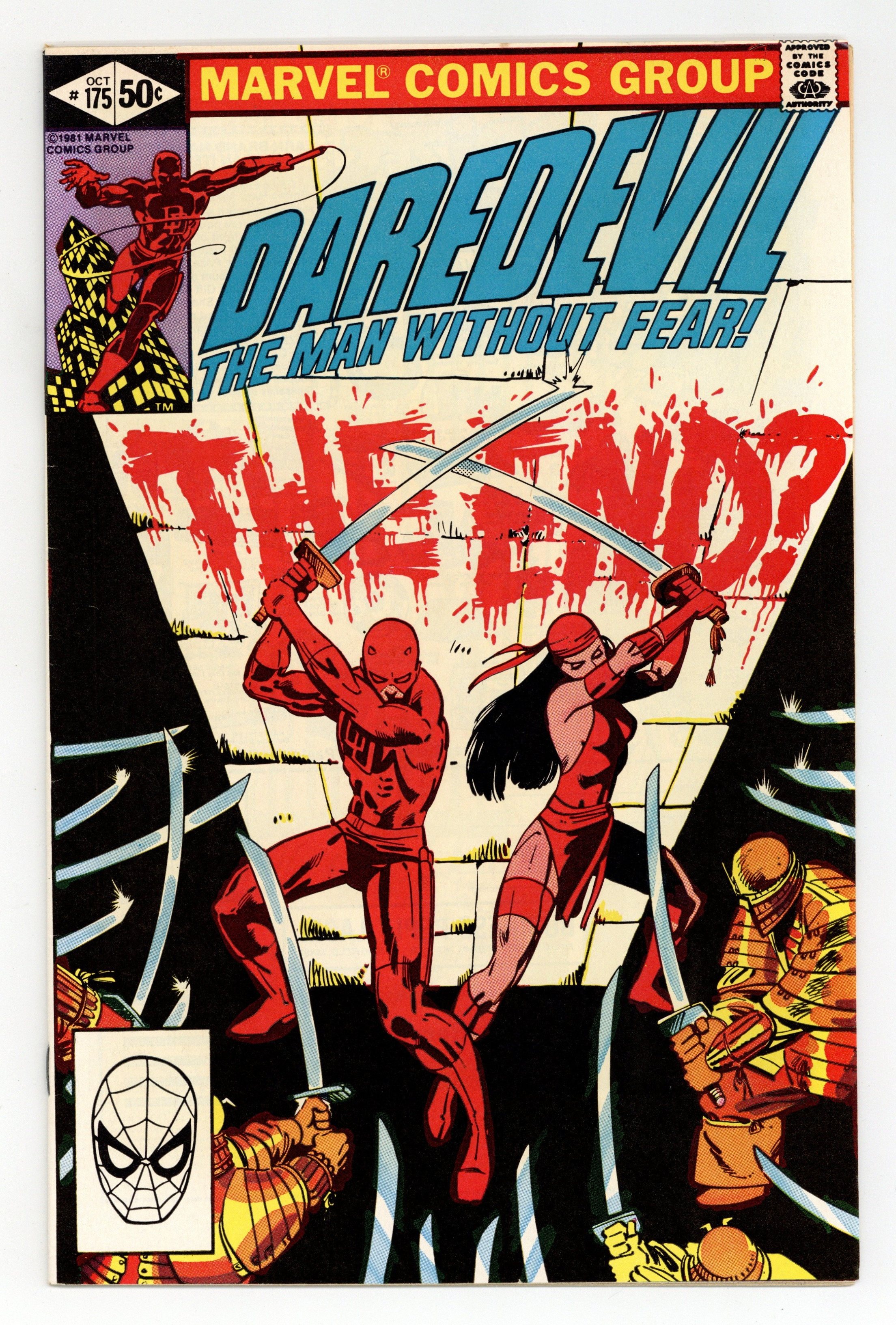 Direct Edition. Cover pencils by Frank Miller, inks by Klaus Janson. Gantlet, script by Frank Miller, pencils by Frank Miller (breakdowns) and Klaus Janson (finished art), inks by Klaus Janson; DD is without his radar sense and teamed-up with Elektra against the Hand and their master assassin, Kirigi; While Matt is off fighting ninja, Foggy is defending the Gladiator in court. Full page pin-up ad for Spider-Woman, pencils by Denys Cowan, inks by Al Milgrom. 36 pgs. Cover price $0.50. Cover price $0.50.