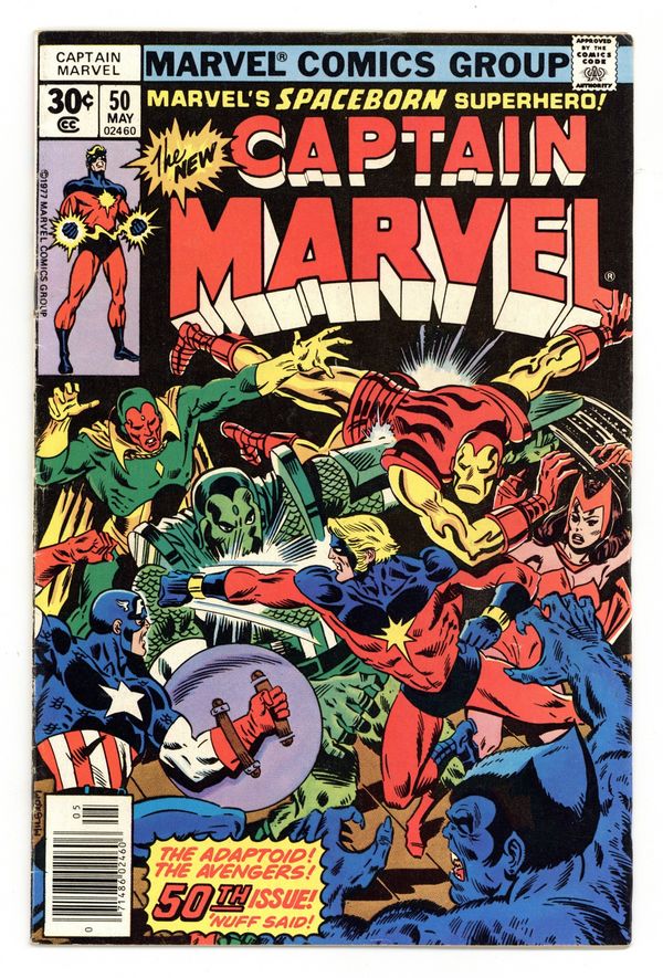 $15.00"To Begin Anew!" Guest-starring the Avengers. Script by Scott Edelman. Pencils by Al Milgrom. Inks by Terry Austin. Cover by Al Milgrom. The Super-Adaptoid is back! And after being accidentally set free during the events of Iron Man 91, the alien A.I.M. construct prepares to return to business! That is…the business of destroying the Avengers! First, the Adaptoid ambushes the golden avenger at Stark Industries and then a short time later charges into Avengers Mansion! Earth's Mightiest Heroes bravely fight off the android's surprise attack, but eventually fall one by one to the Adaptoid's mimicking powers! Fortunately though, earlier in the evening Jarvis attended one of Rick Jones' concerts and invited him back to the mansion for a chat. Once Rick sees the battle in progress, he summons the Kree Warrior! And the dynamic donnybrook is set! The Beast, Vision, Scarlet Witch, Captain America, and Captain Marvel vs. the Super-Adaptoid! Avengers (plus one) Assemble! Cameo appearances by Ronan and Minerva (first appearance). Flashback cameos by Chronos, Zeus, and Mentor. Avengers Lineup: Beast, Captain America, Iron Man, Scarlet Witch, and the Vision. (Notes: The Super-Adaptoid previously appeared in Iron Man 51 and returns to battle the Avengers again in Marvel Two-in-One 75. This issue includes a full-page ad for Hostess Cupcakes featuring Captain America.) 32 pages. Cover price $0.30.