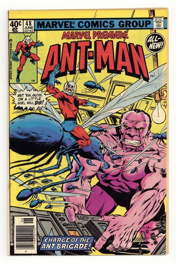 $9.30Newsstand Edition. Cover pencils by Dave Cockrum, inks by Bob McLeod. "The Price of a Heart!", script by David Michelinie, pencils by John Byrne (breakdowns) and Bob Layton (finished art), inks by Bob Layton; Scott Lang, the new Ant-Man, attempts to get Dr. Sondheim out of the clutches of the mutated Darren Cross; However, he underestimates Cross' enhanced abilities and is defeated; His equipment disabled, Scott listens as Cross explains his heart condition and the implantation of a "nucleorganic pacemaker"; The device backfired, not only slowly mutating him into a Neanderthal-like giant but also wearing out his heart, necessitating periodic transplants from unwilling donors; Learning he is to be next in line to be a "donor" Scott manages to fix his equipment and escape, busting back into the surgical theatre just as Dr. Sondheim finished another operation; Ant-Man fights Cross. Next appearance of Ant Man is in Iron Man (Marvel, 1968 series) #125. 36 pgs., full color. Cover price $0.40.
