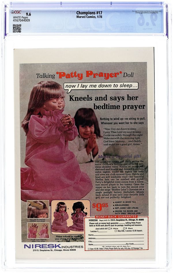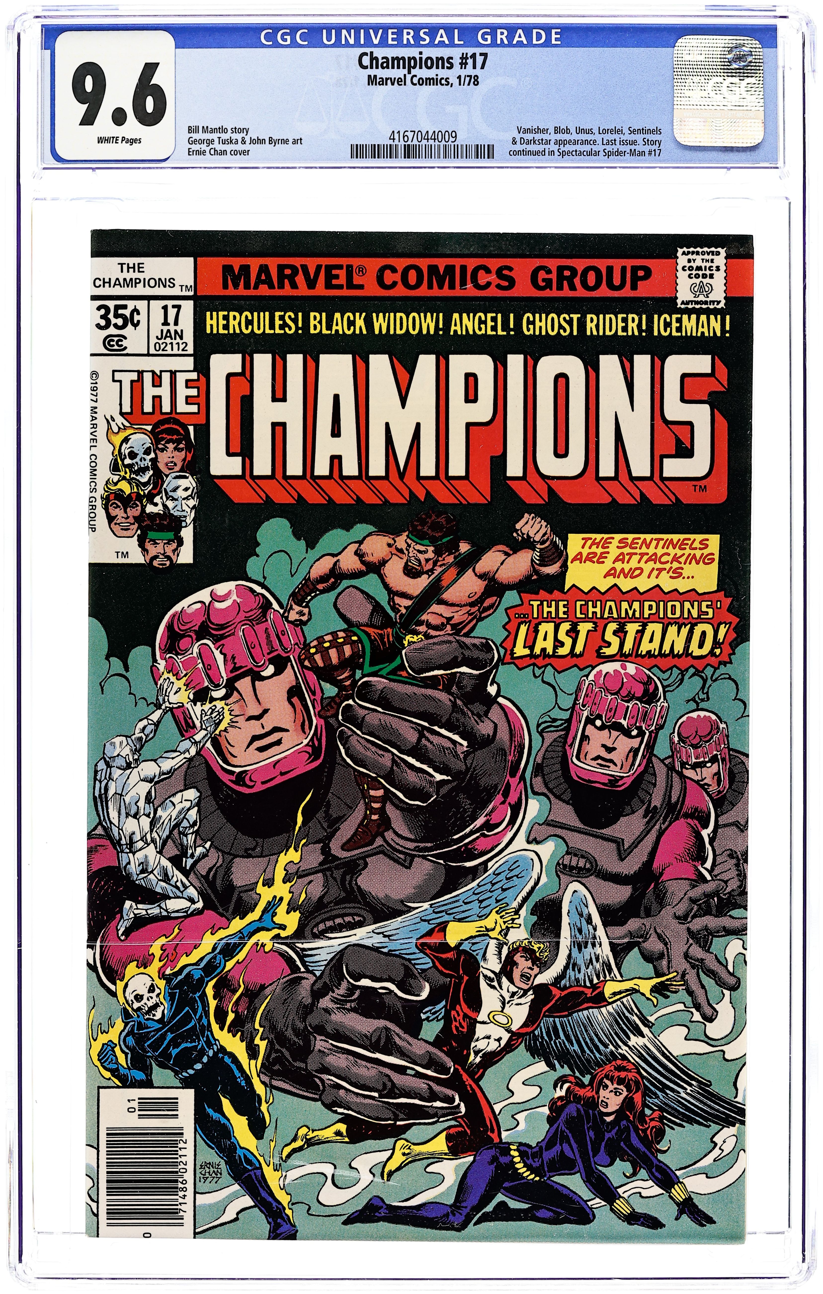 Final Issue. "Death Drone!" Guest-starring Darkstar. Story by Bill Mantlo. Art by George Tuska and John Byrne. Cover by Ernie Chan. The Champions are challenged by the mutant hunting Sentinel robots. And if that wasn't bad enough, the Vanisher and his Brotherhood of Evil Mutants wait in the shadows to destroy which ever side wins. Cover price $0.35.
