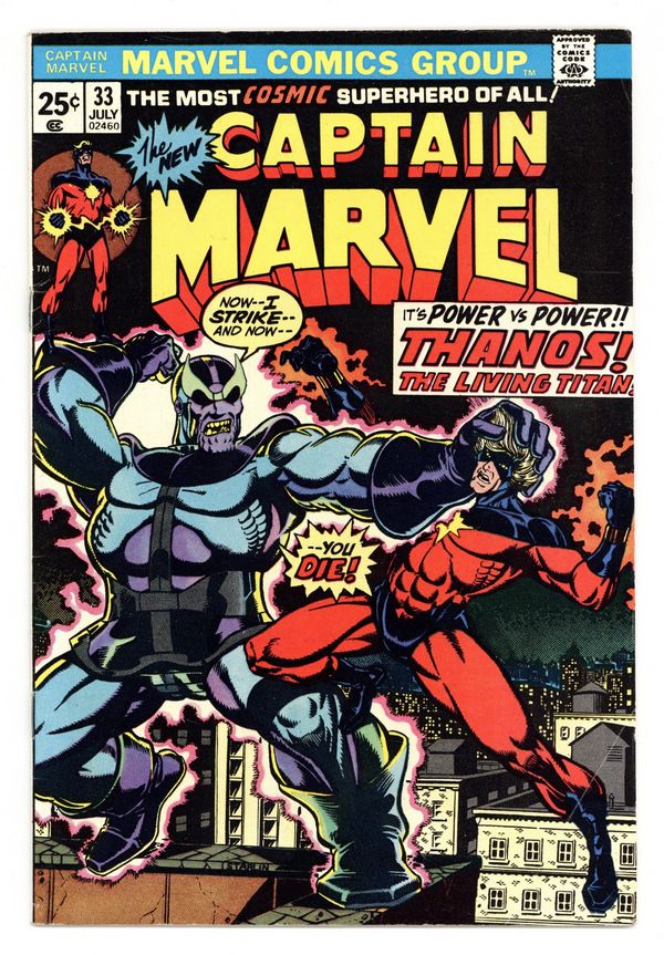 Captain Marvel battles Thanos in "The God Himself!" Script by Steve Englehart, plot and pencils by Jim Starlin, inks by Klaus Janson. Guest starring Drax the Destroyer. Brief appearance by the Avengers (Thor, Iron Man, the Vision, the Swordsman, Captain America, the Black Panther, and the Scarlet Witch). The letters page contains Marvel Value Stamp series A # 6 (Thor by John Buscema). Starlin cover. Cover price $0.25.