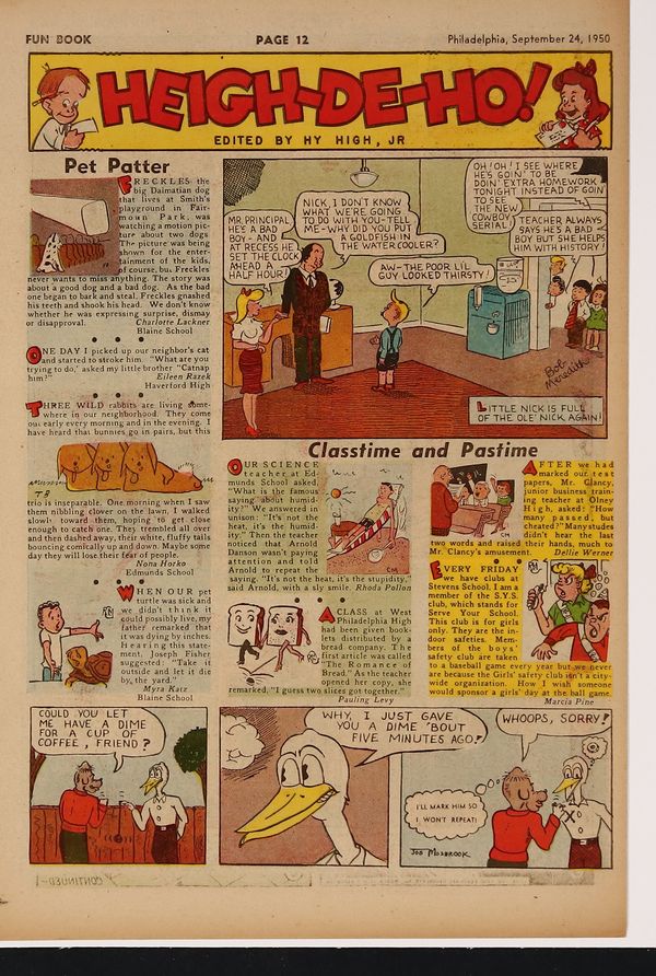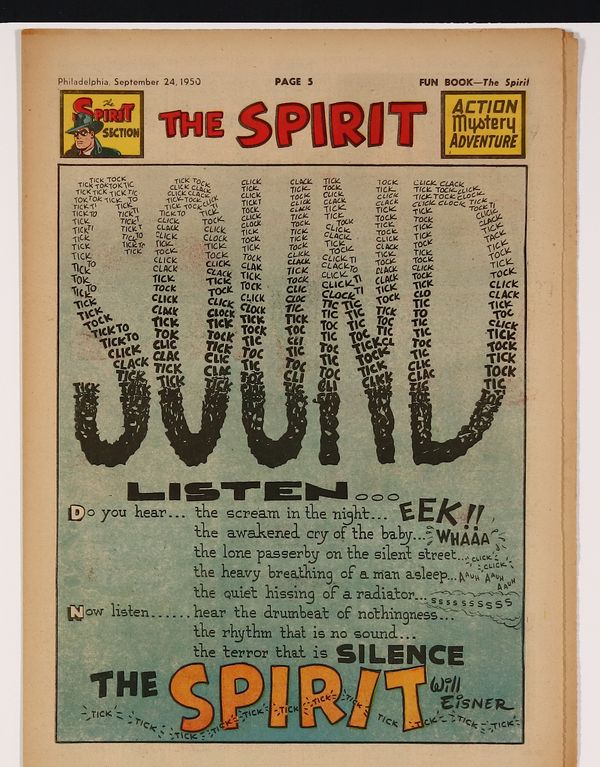 September 24, 1950. Spirit Weekly Newspaper section. Scripts by Eisner or Feiffer, or Eisner/Feiffer, or Nordling. Art by Eisner with backgrounds by Eisner, Grandenetti, Le Blanc, Stallman, Nordling, Dixon and/or others except where noted. Tabloid Sized Newsprint, 10-3/4" x 15", 8 pages, full color.