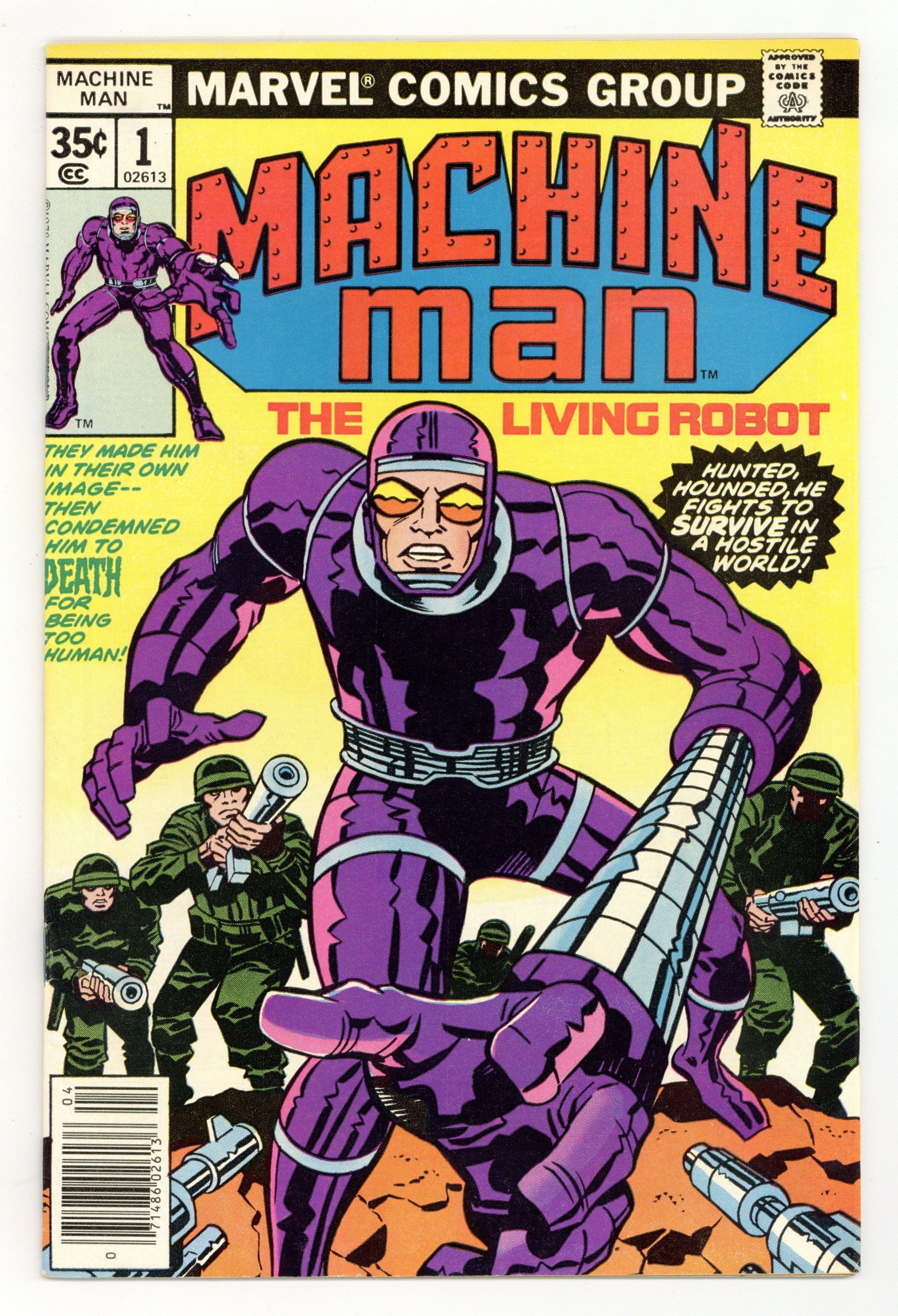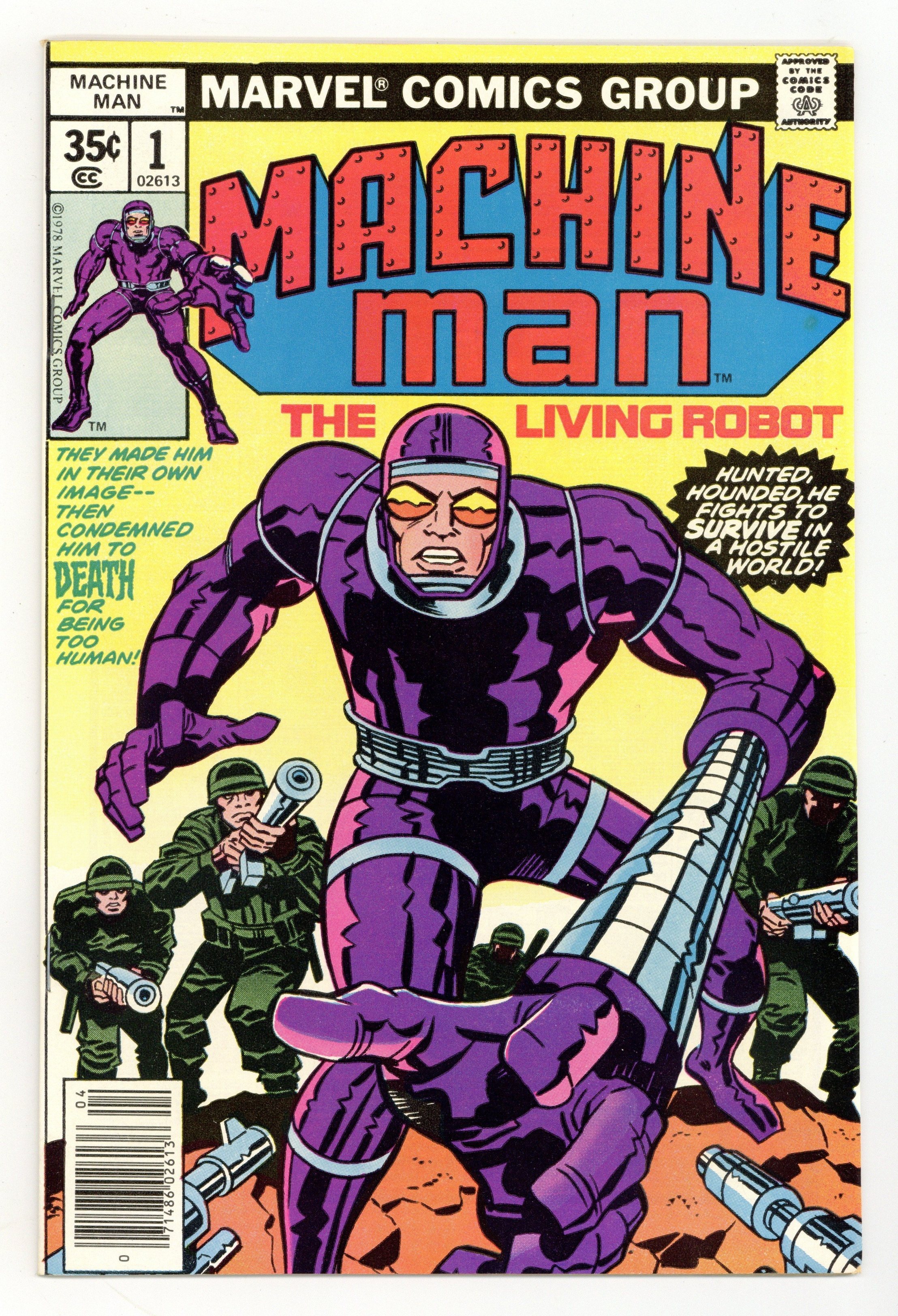 $26.50Cover pencils by Jack Kirby, inks by Frank Giacoia. "Machine Man," script and pencils by Jack Kirby, inks by Mike Royer; While Machine Man is busy saving the life of a hiker in danger, he is unaware that Dr. Broadhurst is receiving a government agent who is informing him that Colonel Kragg has been assigned to terminate the last surviving X-51 unit; Machine Man walks deeper into the forest where he comes across Peter Spaulding, whose van is struck behind a fallen tree; After MM moves the tree out of the way, Peter offers Machine Man a lift; They make small talk in the van until Machine Man learns that Peter is a psychiatrist and becomes uncomfortable and exits the van in traffic; Using a skateboard built into his feet, Machine Man attracts the notice of the police, who in turn alert the troops of Col. Kragg. Mr. Machine renamed Machine Man; cont'd from 2001: A Space Odyssey #10. 36 pgs., full color. Cover price $0.35.