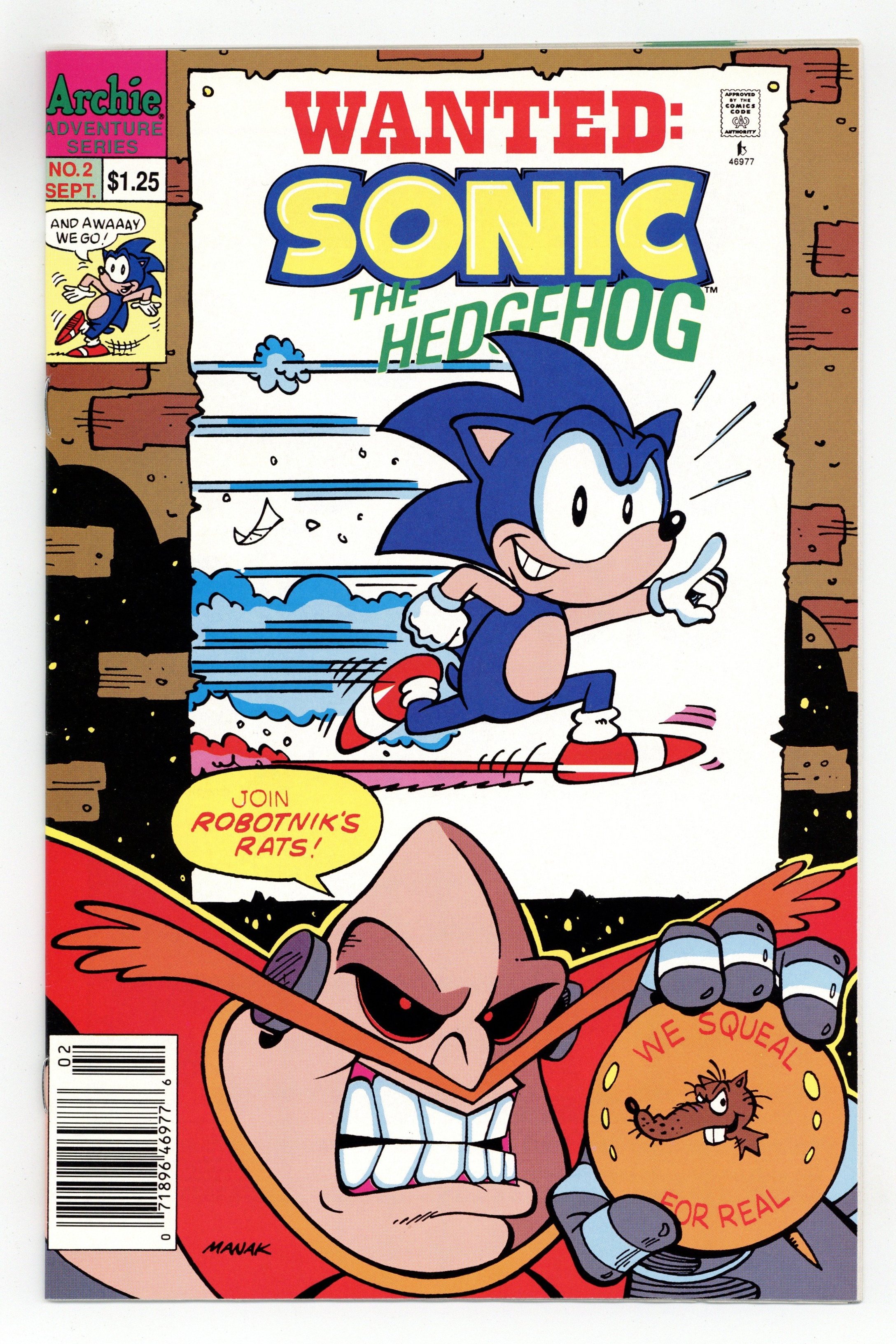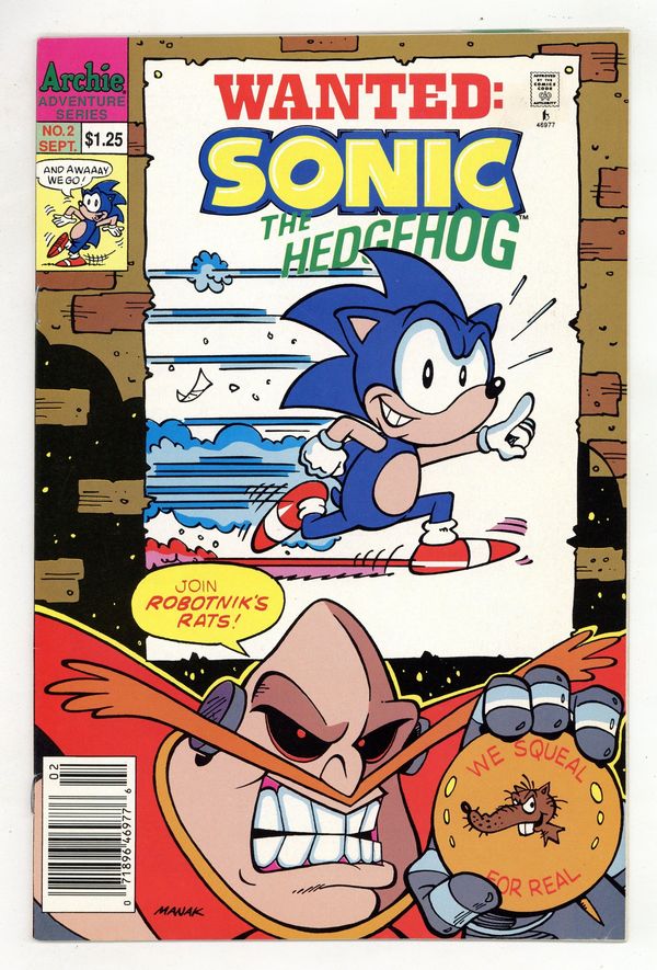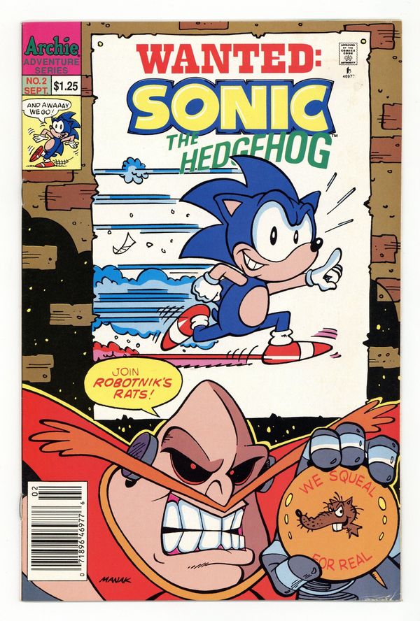 Published Sep 1993 by Archie Publications.$30.00Newsstand Edition. Cover art by Dave Manak. Triple Trouble; Robotnik develops a new robot adversary for Sonic: a robot monkey who throws explosive coconuts. In The Beginning; Sonic presents humorous examples of rejected Sonic concepts. Vertigo A-Go-Go; While collecting magic rings, Sonic is transported to a strange dimension inhabited by two even stranger beings. All The Mail's About Tails. Scripts by Michael Gallagher, pencils by Dave Manak, inks by Jon D'Agostino. Inspired by the Sega Genesis videogame. Cover price $1.25.
