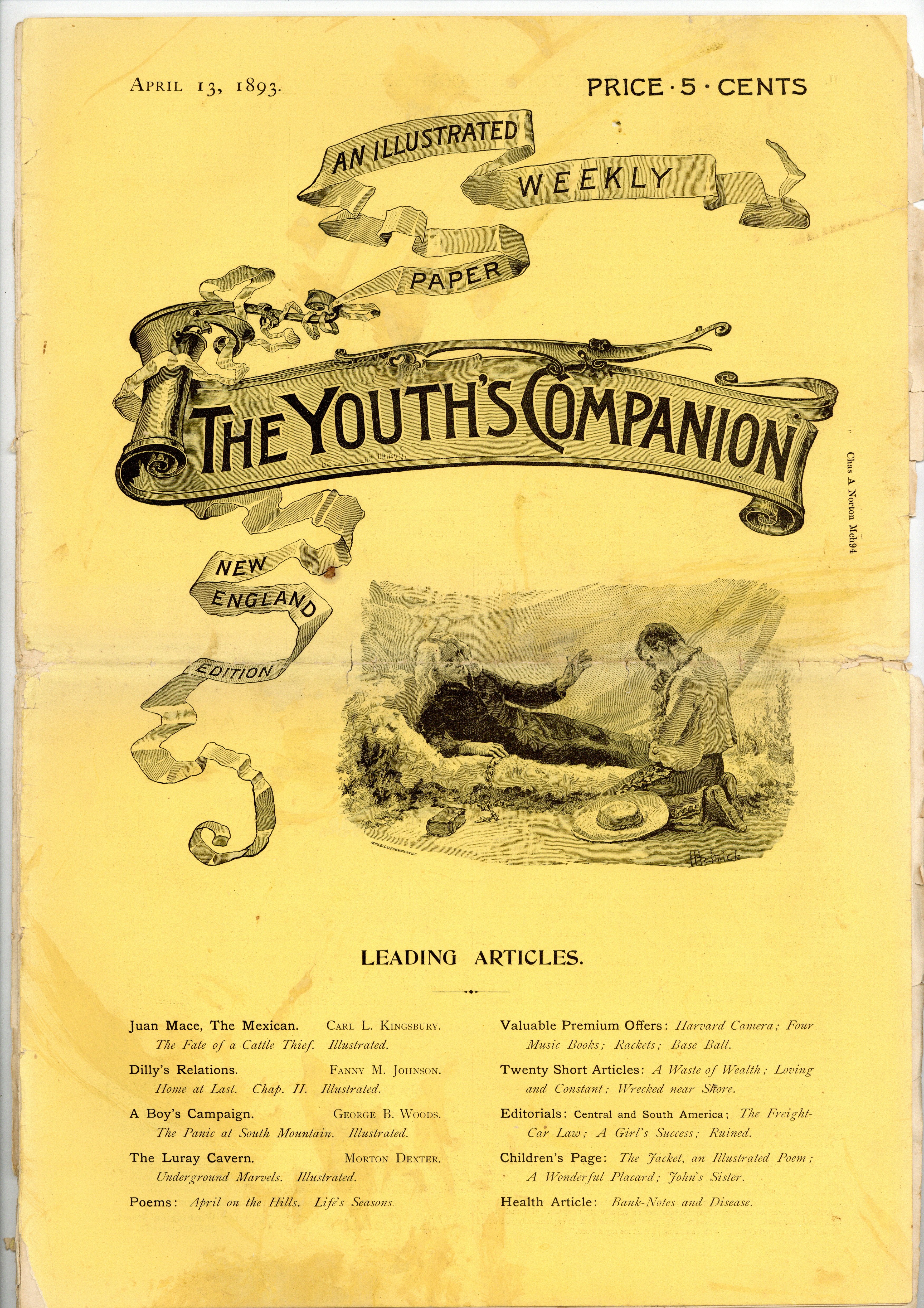 New England Edition of The Youth's Companion, a weekly folded tabloid printed on good quality newsprint. 11" x 16" unfolded, 16 pages, B&W. Cover price $0.05.