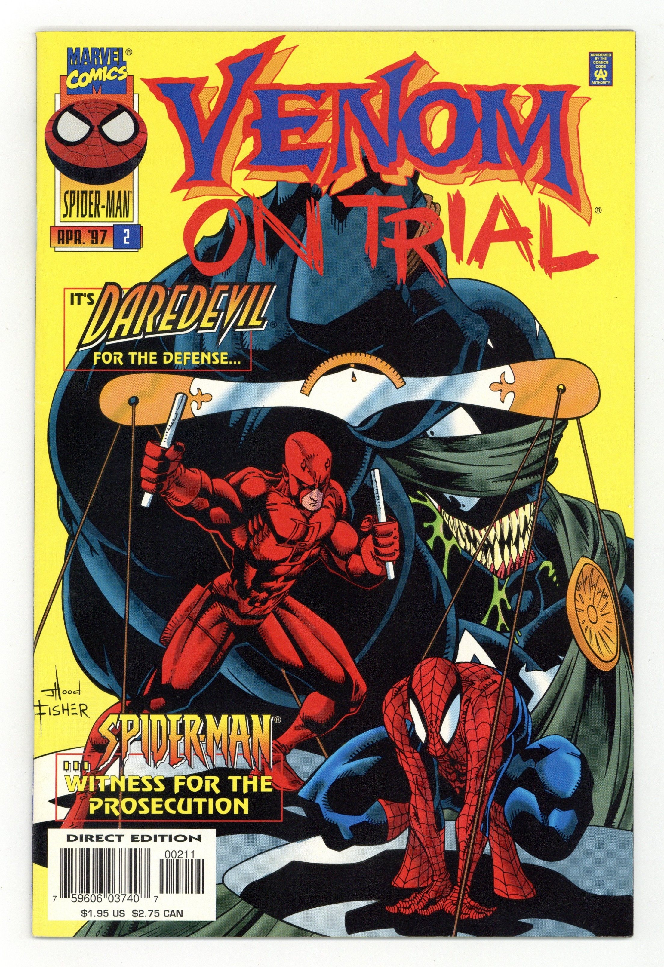 Tags: Marvel Legacy Numbering: Venom (part 52), Spider-Man$16.50With Matt Murdock (a.k.a. Daredevil) acting as his defense attorney, you'd think Venom would get off scott free, right? Wrong, because the prosecution brings in a surprise witness--none other than the ever amazing Spider-Man! Looks like Venom will have to take matters into his own hands again! Written by Larry Hama. Art and cover by Josh Hood and Derek Fisher. Cover price $1.95.
