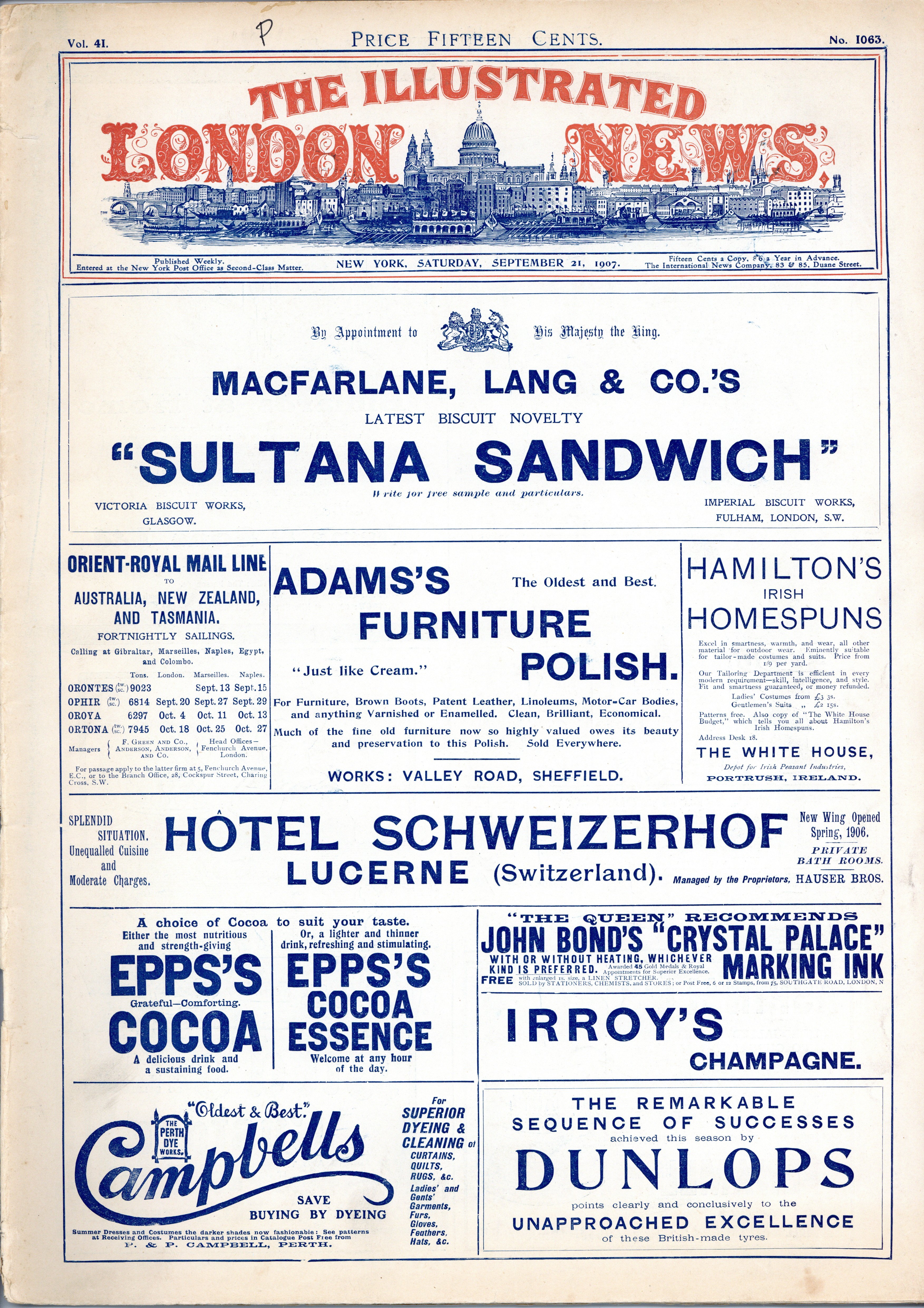 September 21, 1907. American version of the weekly news magazine published in England. 42 pages, four color, 11.5" x 16". NOTE: Information is limited on this series. Page counts vary from issue to issue. Page counts may be unconfirmed. May or may not include cover page. Cover price $0.15.