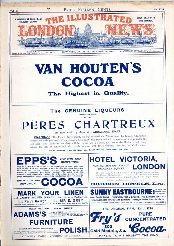 Published Dec 1907 by Illustrated London News.$10.00- Spine split 60%. Staple rust: Extensive.