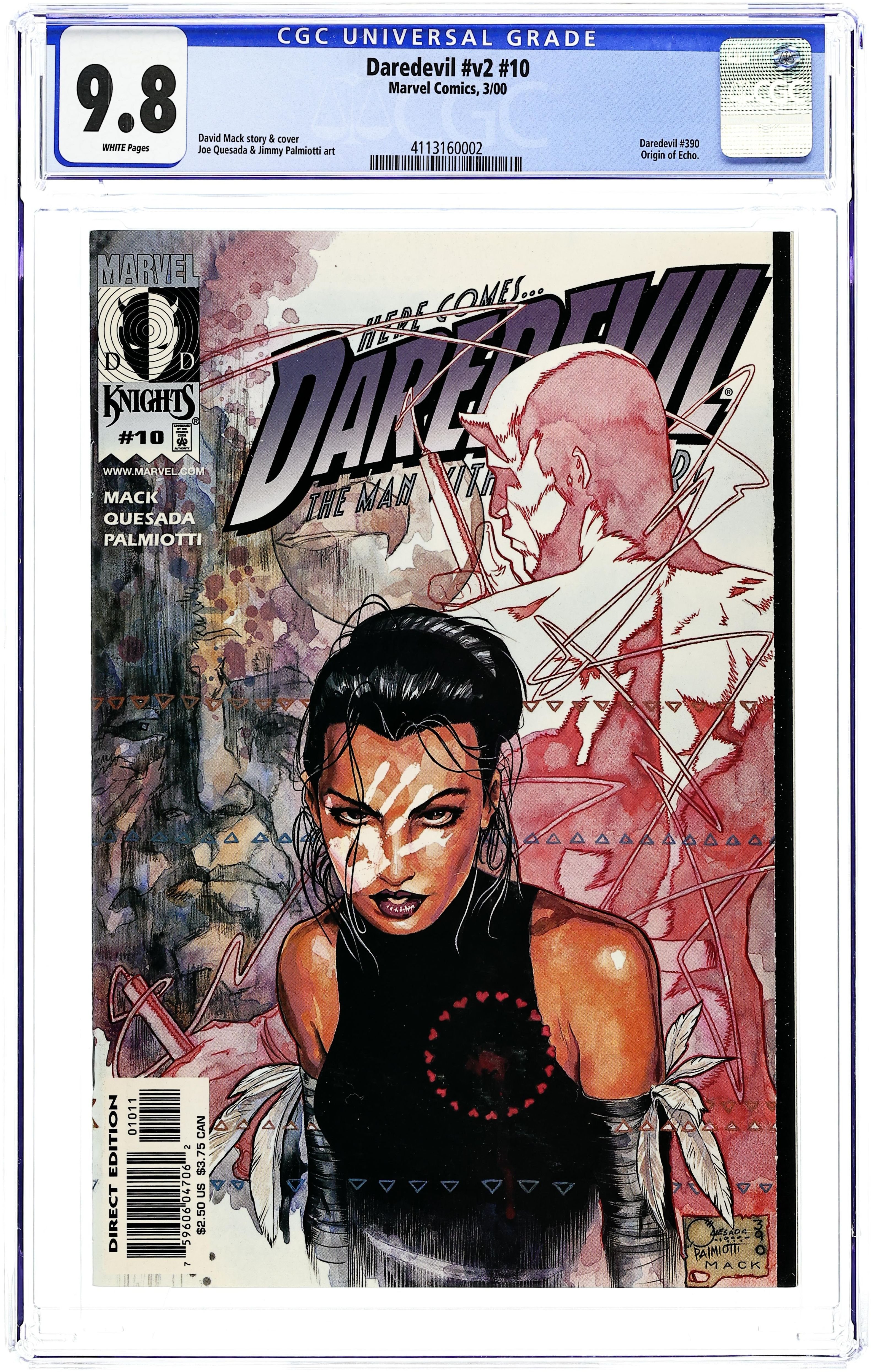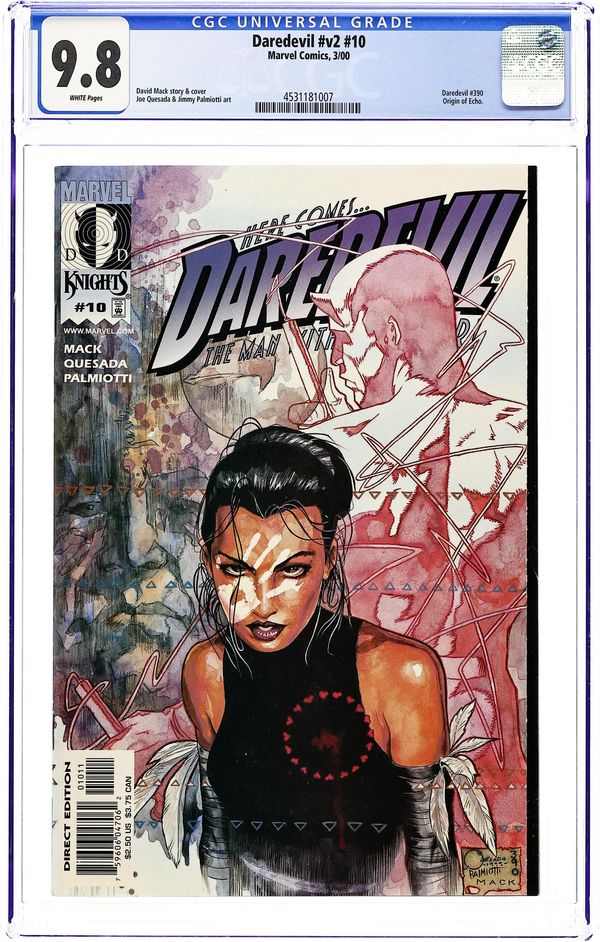 cover by quesada, PALMIOTTI & mack david mack/joe quesada/jimmy palmiotti Introducing Echo, a new villain so strange you'll swear you're hearing her name over and oer and over and...! Matt Murdock gets slapped upside the head by Cupid as a new romantic interest enters his still shattered life. But is she the lady of his dreams or a nightmare waiting to happen? Plus: Daredevil uncovers a deep dark secret thatcould destroy the Kingpin! "Quesada's art is simply gorgeous. A classic in the making and the best mainstream comic around at the moment, bar none. Score: 10 (out of 10)" -Comics International " Cover price $2.50.