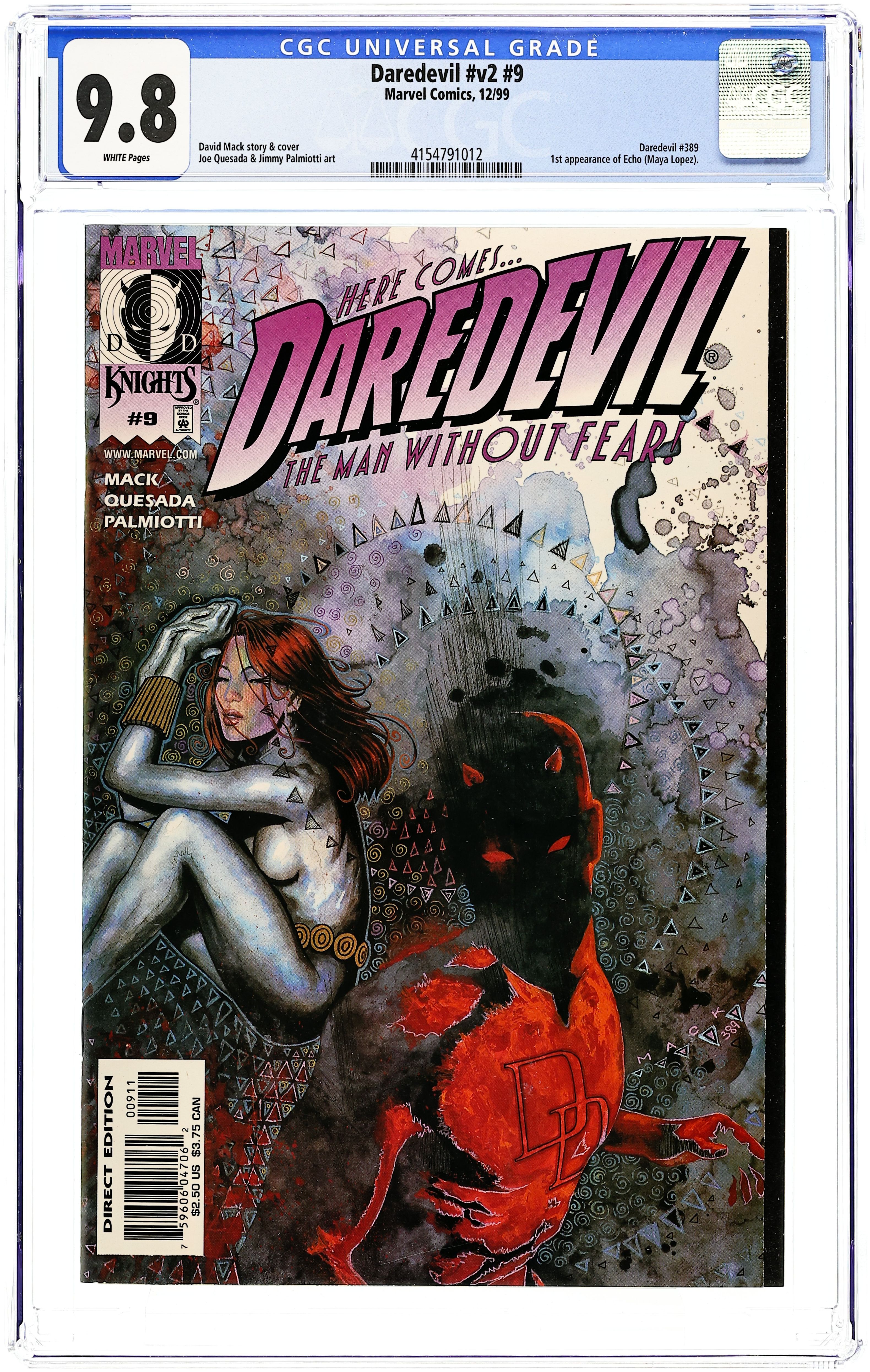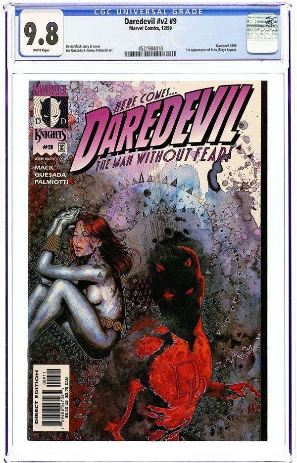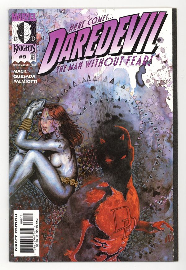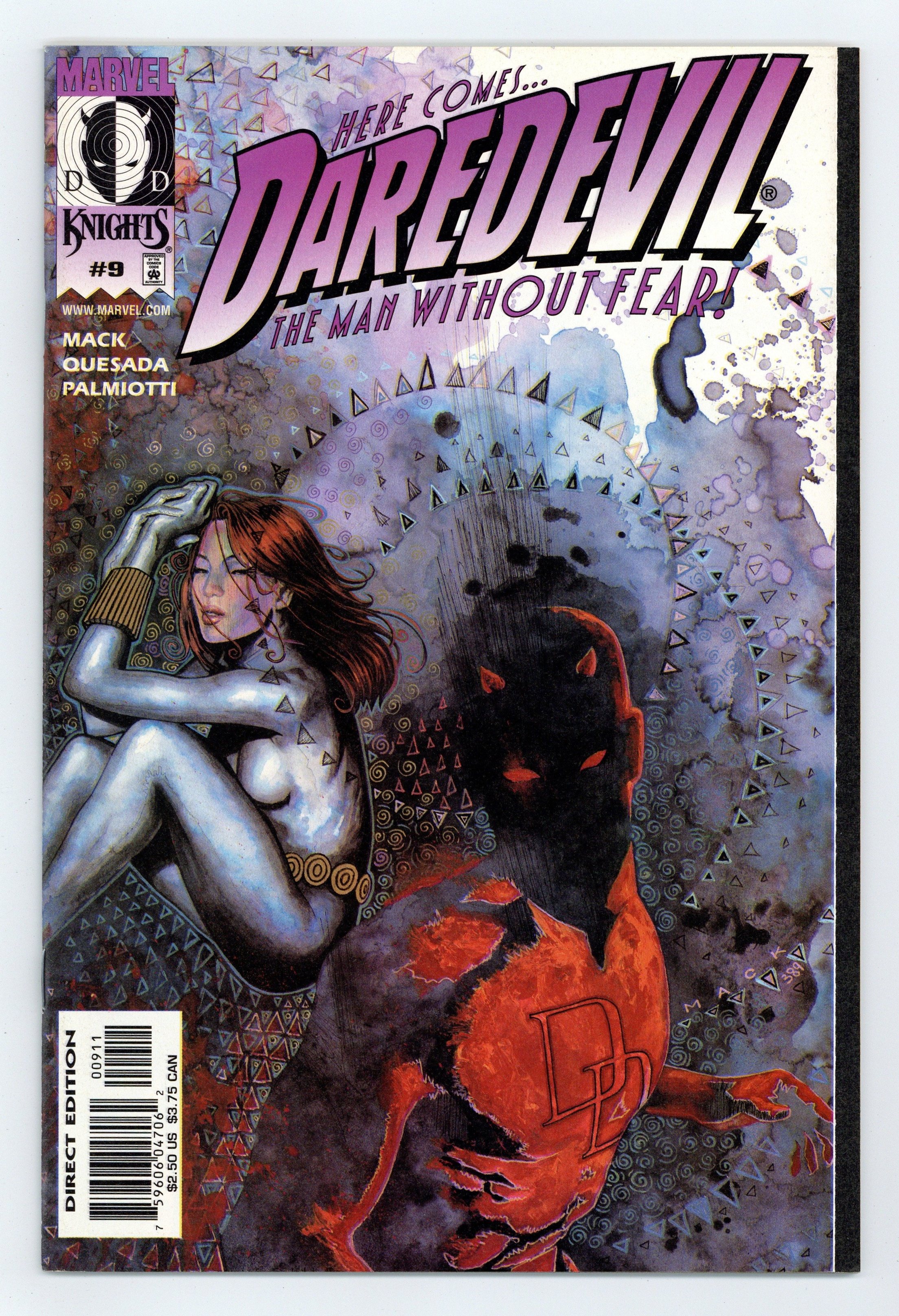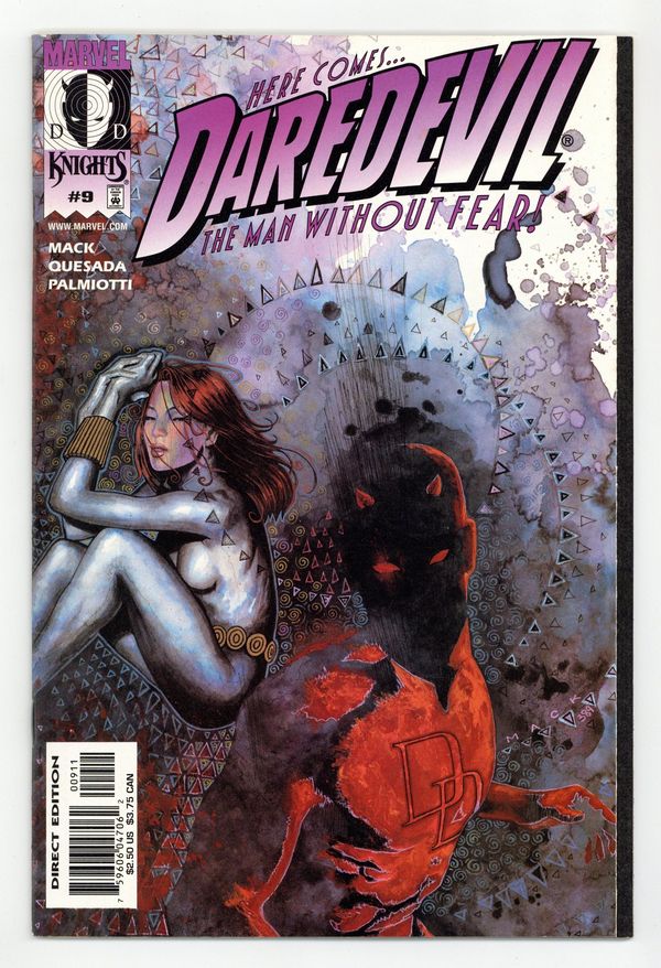 Direct Edition. Painted cover by David Mack. Joe Quesada and Jimmy Palmiotti welcome aboard new writer David Mack! As Matt Murdock attempts to rebuild his life from the ashes of the "Guardian Devil" story arc, old friends and new foes arrive! And when a mysterious man contacts Matt and claims to know the secret of Wilson Fisk's criminal empire, a new twist is added to the battle between Daredevil and his nemesis, the Kingpin!" Cover price $2.50.
